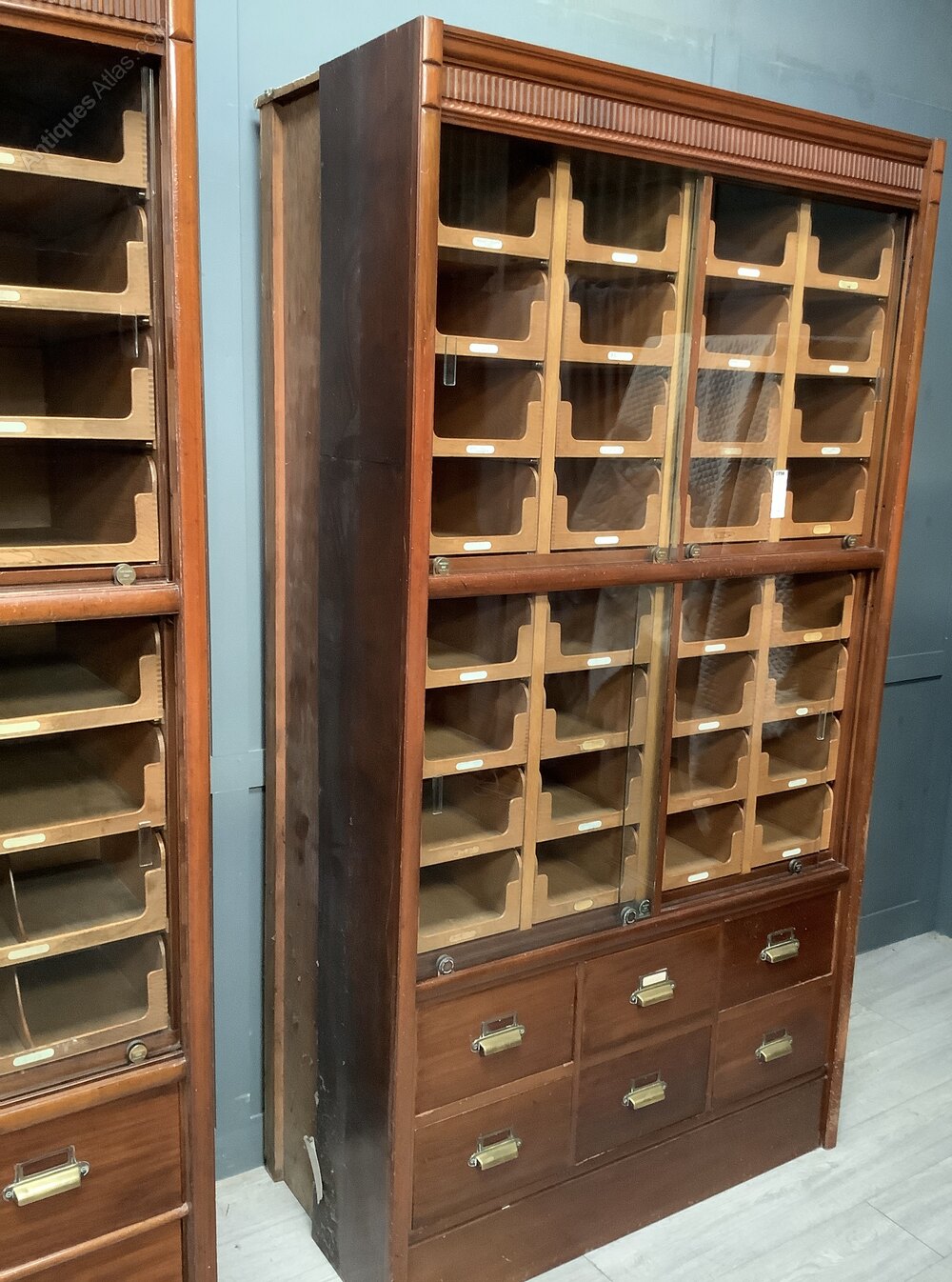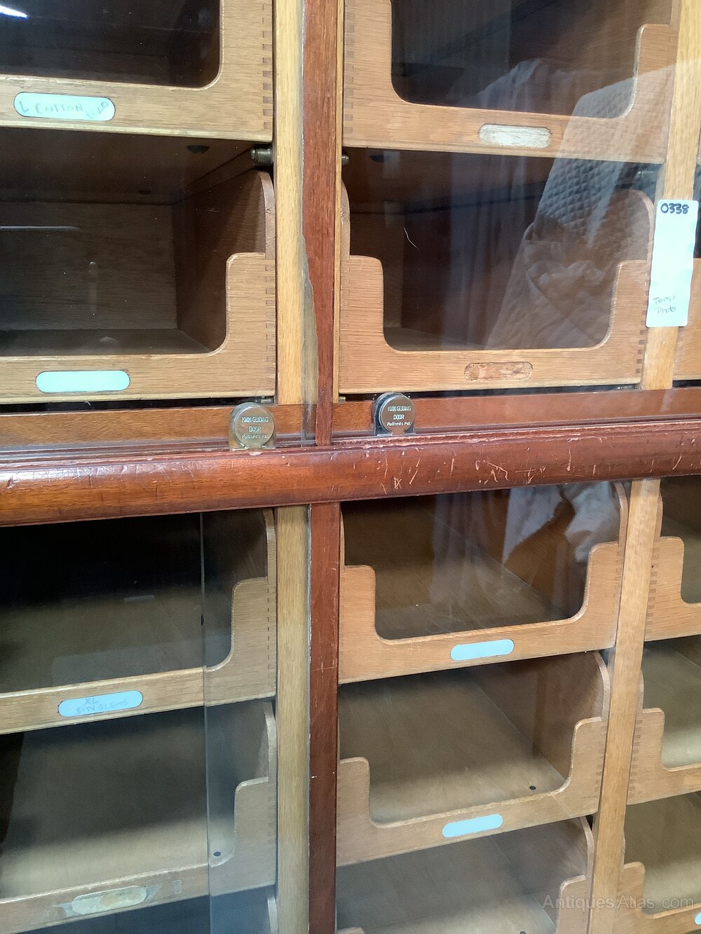 This is a Pollard & Co fine quality set of “kwikserving” haberdashery slides and drawers dating from c1910. The unit is mahogany with oak drawers. The unit has 32 sliding open front drawers on brass rollers at the front and all behind two glass sliding doors on rollers stamped with the Pollard name the drawers have some of the original name labels. There are 6 solid front deeper drawers to the base these have brass pull handles with brass label frames above. The unit has a decorative freeze and solid base.