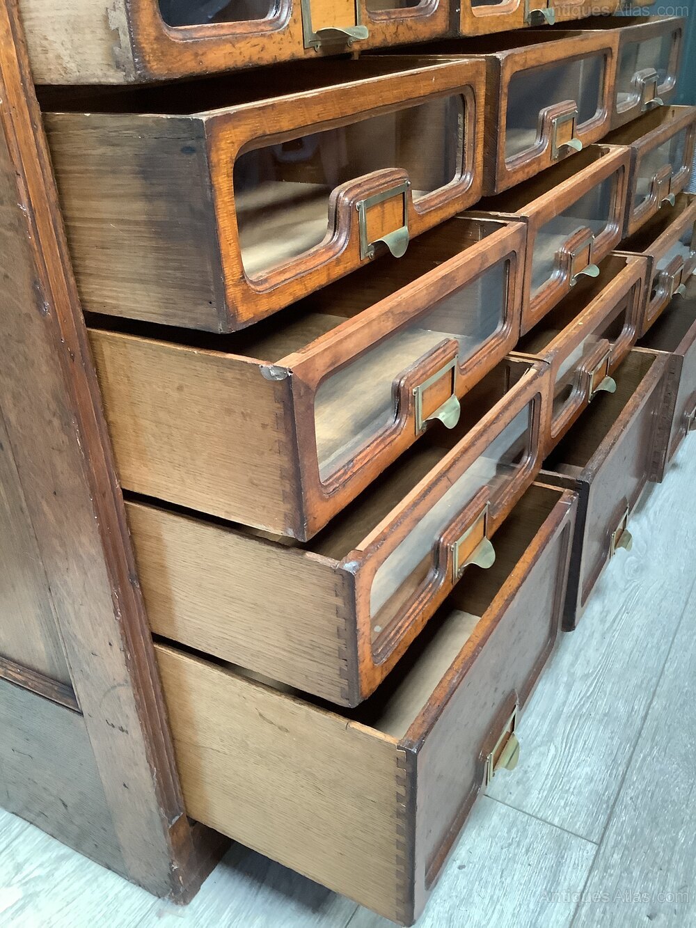 This is a real beauty the mellowed patinated oak is a super colour oak at its very best. This cabinet consists of 36 drawers in total 3 solid front oak drawers to the base, above them is 12 glass fronted drawers above them 21 glass fronted drawers of a slightly lesser depth. Each drawer is solid oak front and sides with the original brass pull handles with the label frames. The cabinet dates from approx. 1910. It is a super colour all the carcass frame being solid oak with inset panelled sides. This cabinet is full of character is in great condition throughout with minor signs of previous ownership throughout which gives this piece its super character. This will offer itself to many uses both domestically as well as in a retail setting or back in a office where it originated from and was used there for many years.