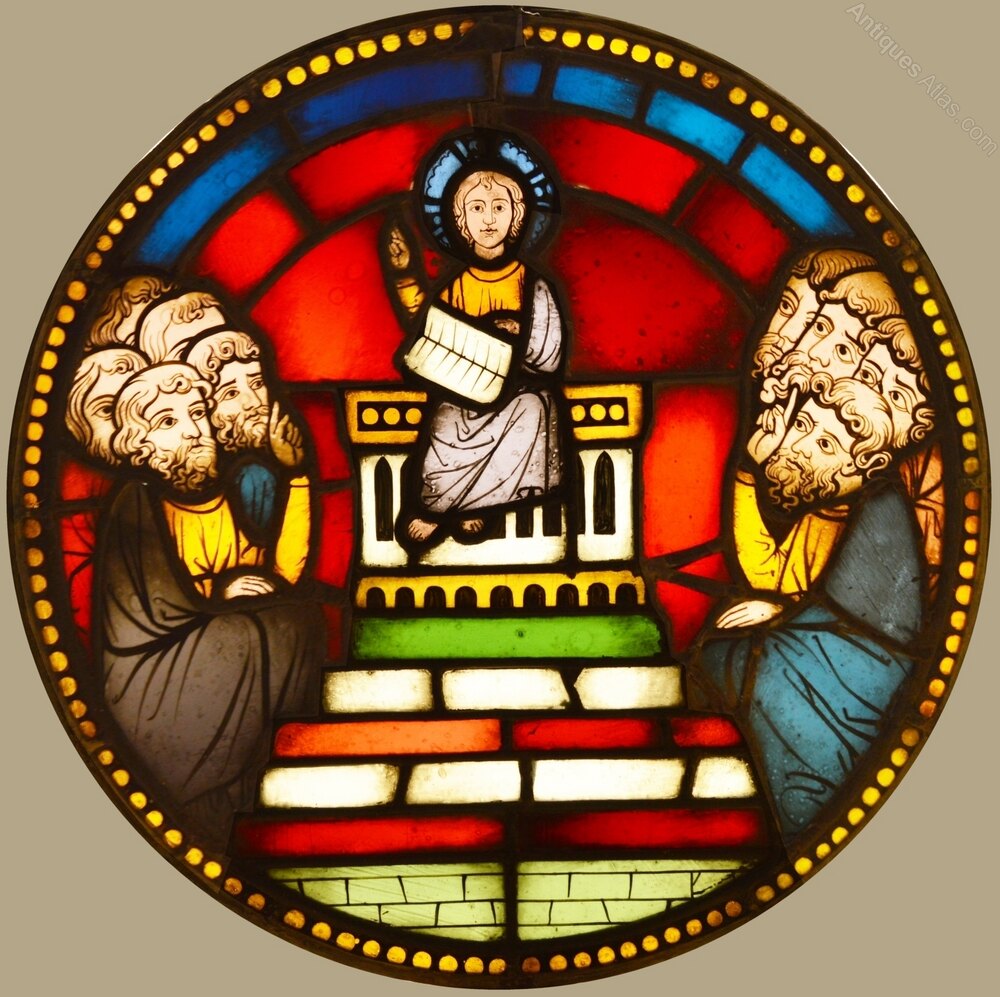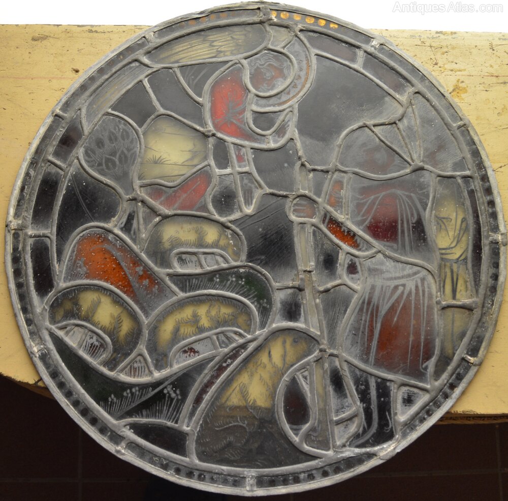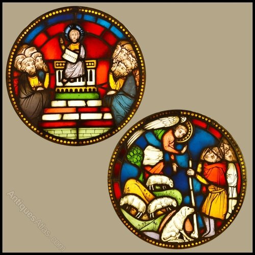 Two large 20th century roundels, each leaded with hand painted stained glass in a 14th century medieval style depicting Christ reading to his disciples & annunciation to the shepherds. Slight restoration which has kept the panels in original condition and both have hanging hooks attached.