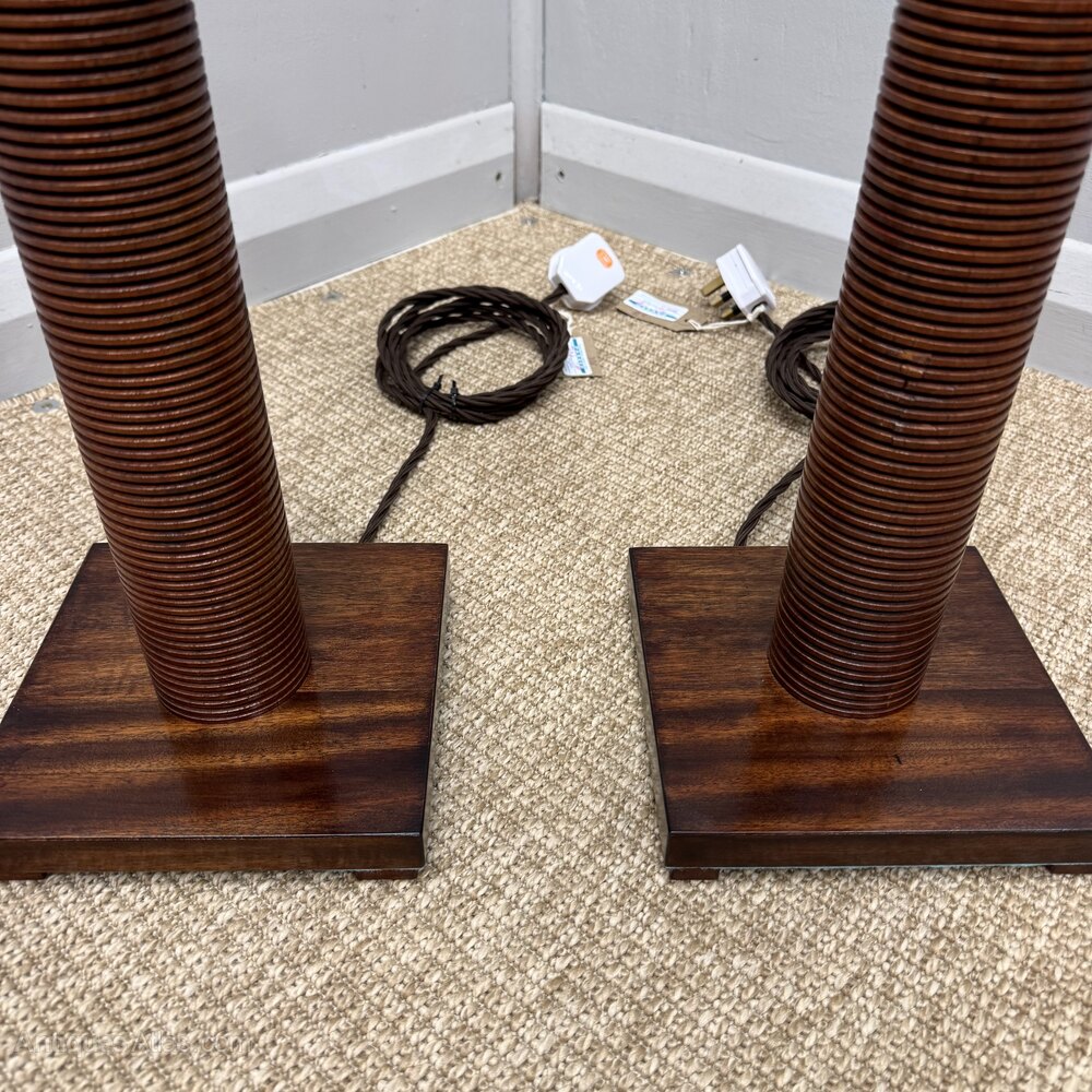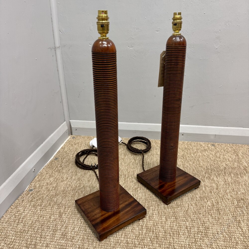 Fabulous pair of late Victorian turned and serrated table lamps on raised square bases, fully rewired with a braided cord.Shown here with an example pair of drum shades to give a sense of proportion (not included).