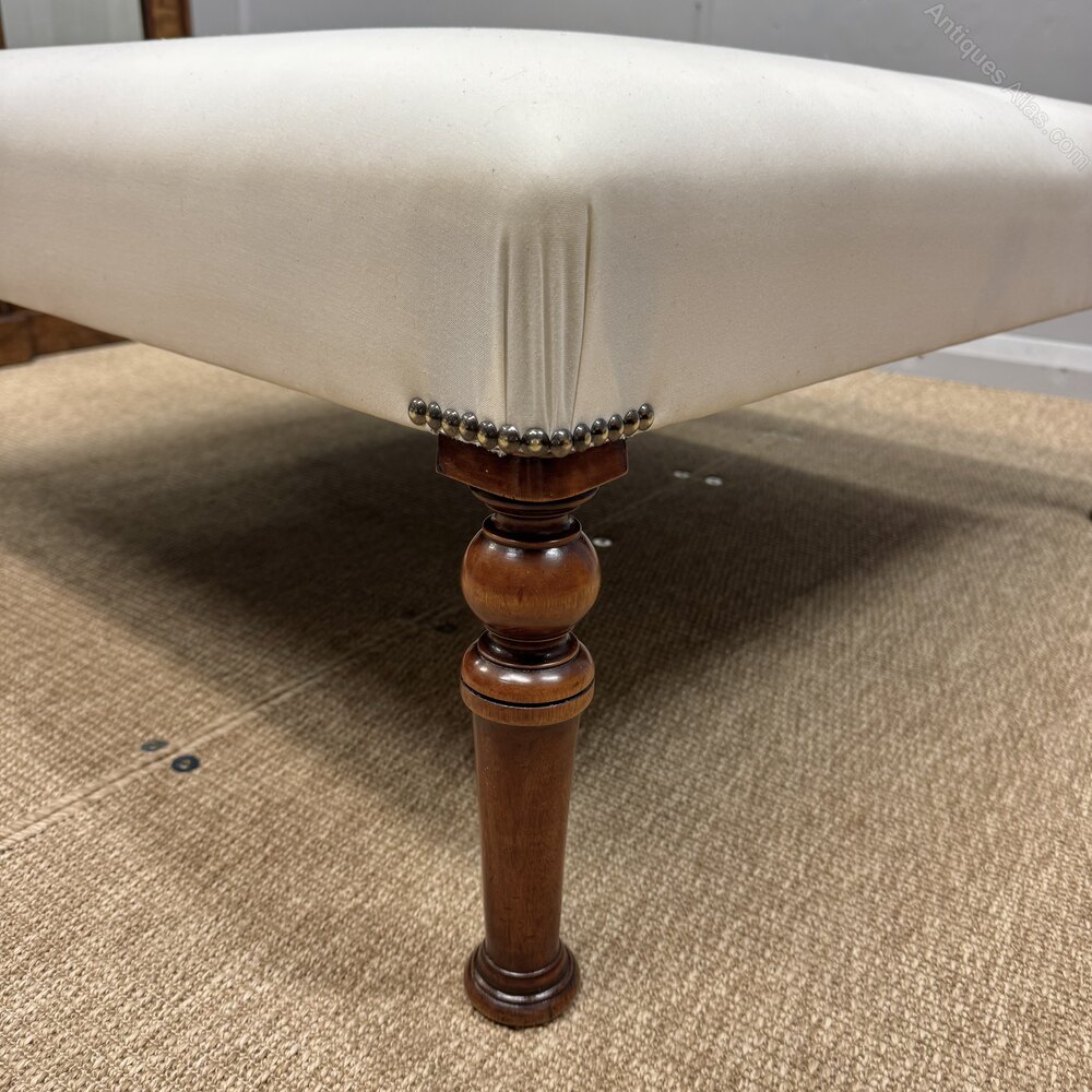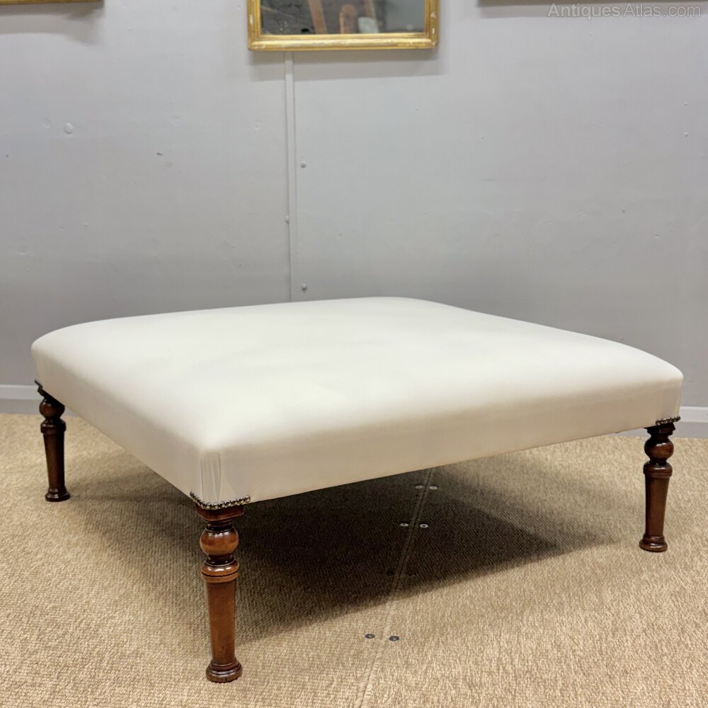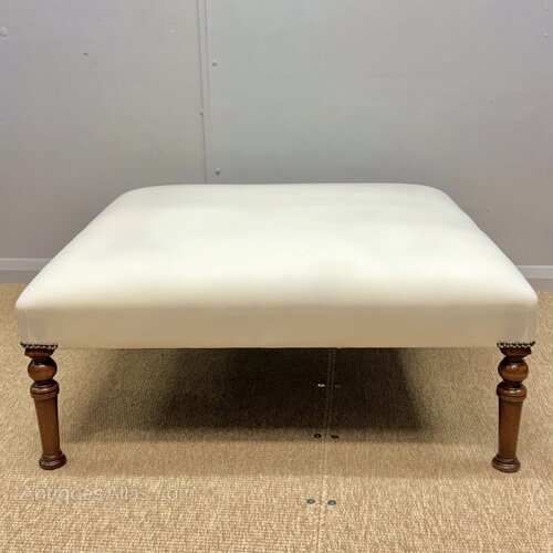 Fantastic size to this large square footstool raised on 19th century turned mahogany legs. Currently finished in a lining fabric, so this is ready for your own choice of fabric (2m required) and will be upholstered within the price, but fabric is to be supplied by you…I can suggest various sources for upholstery fabrics or you may have something in mind already!Or, it can go as it stands here in the lining fabric for a reduction in price.