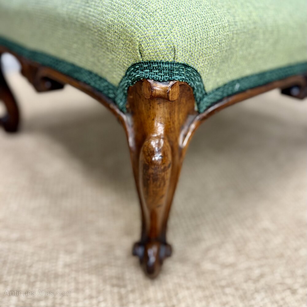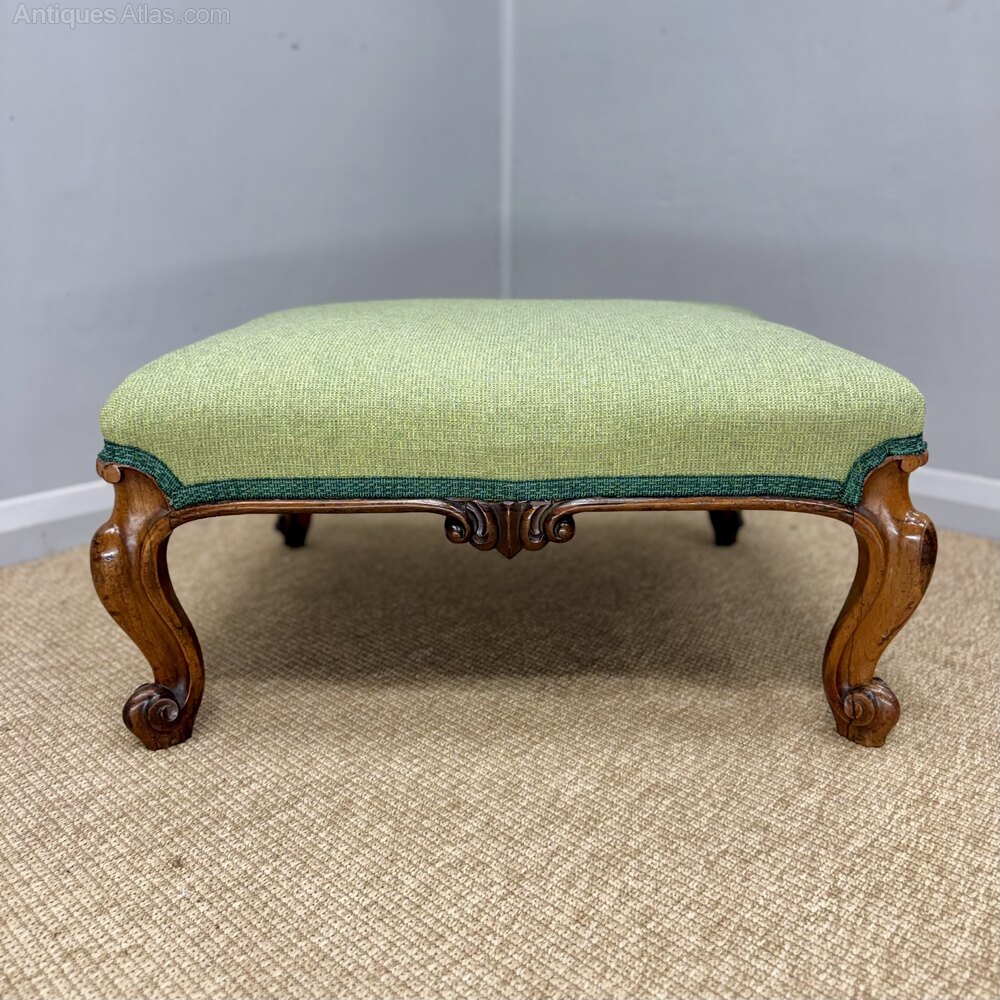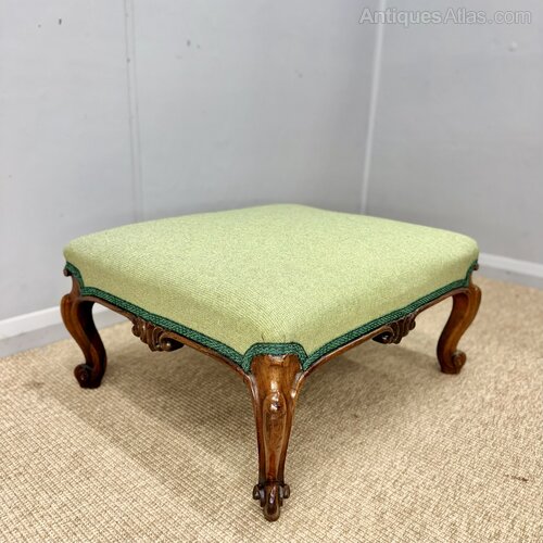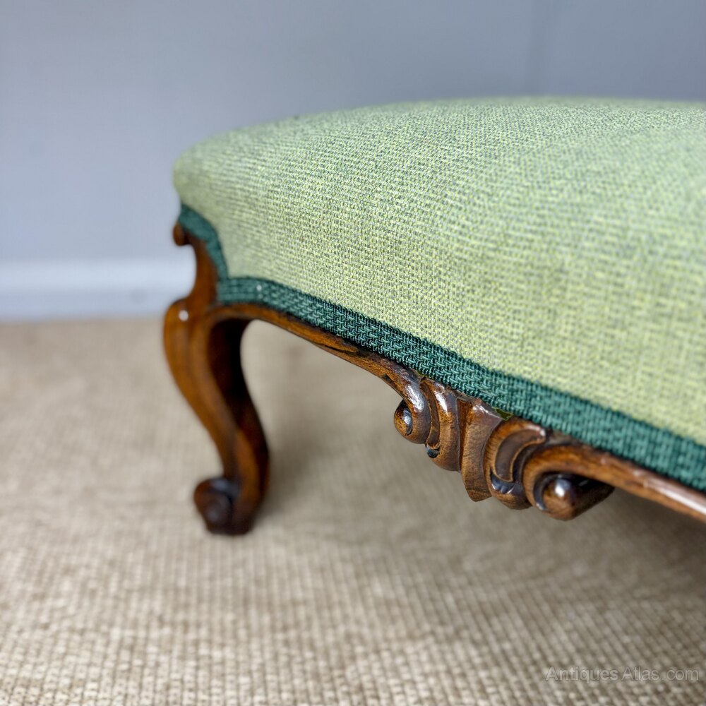 Newly upholstered and of a good size Victorian rosewood footstool with a beautifully carved solid rosewood frame on cabriole legs, circa 1880 and in great condition. Ideal size for a two seater sofa and a good decorative piece. Also totally fine to be sat upon too as and when required for additional seating.Measurements: