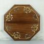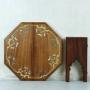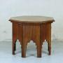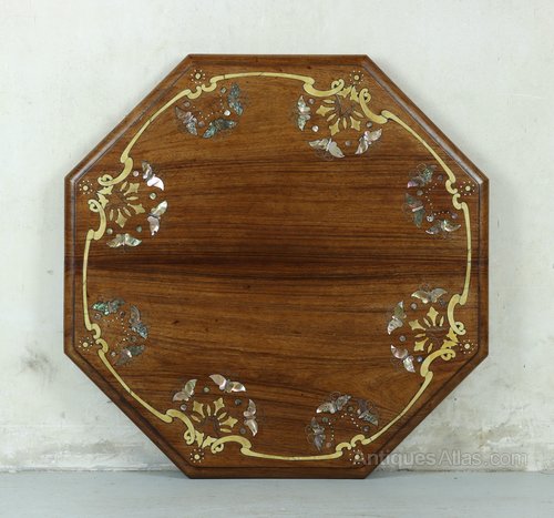 This is a stunning circa 1900 Indian folding hardwood table with an octagonal top inlaid with mother of pearl and bone, with a label to underside stating 'Mysore City Arts & Crafts'. The design of a scrolling ribbon with a symmetrical arrangement of flowers and butterflies at each of the corners is clearly inspired by the European Arts and Crafts Movement.The unadorned base has arched feet in the Moorish style which neatly folds up allowing the table to be stored when not in use. The hardwood grain has similarities to rosewood but with less figuring and identified with fair confidence as Padauk.