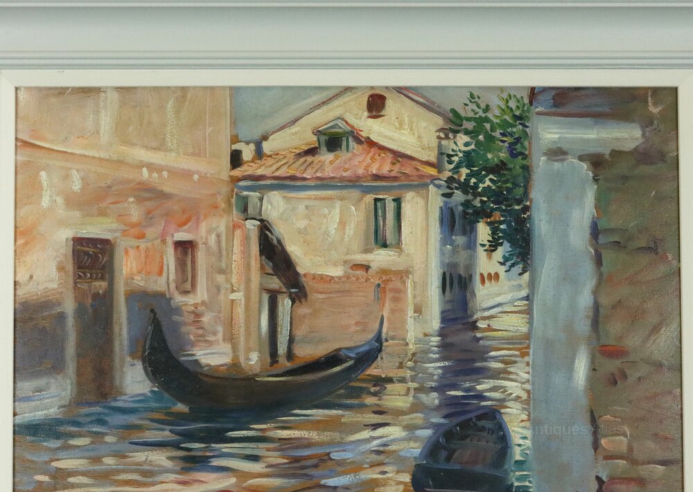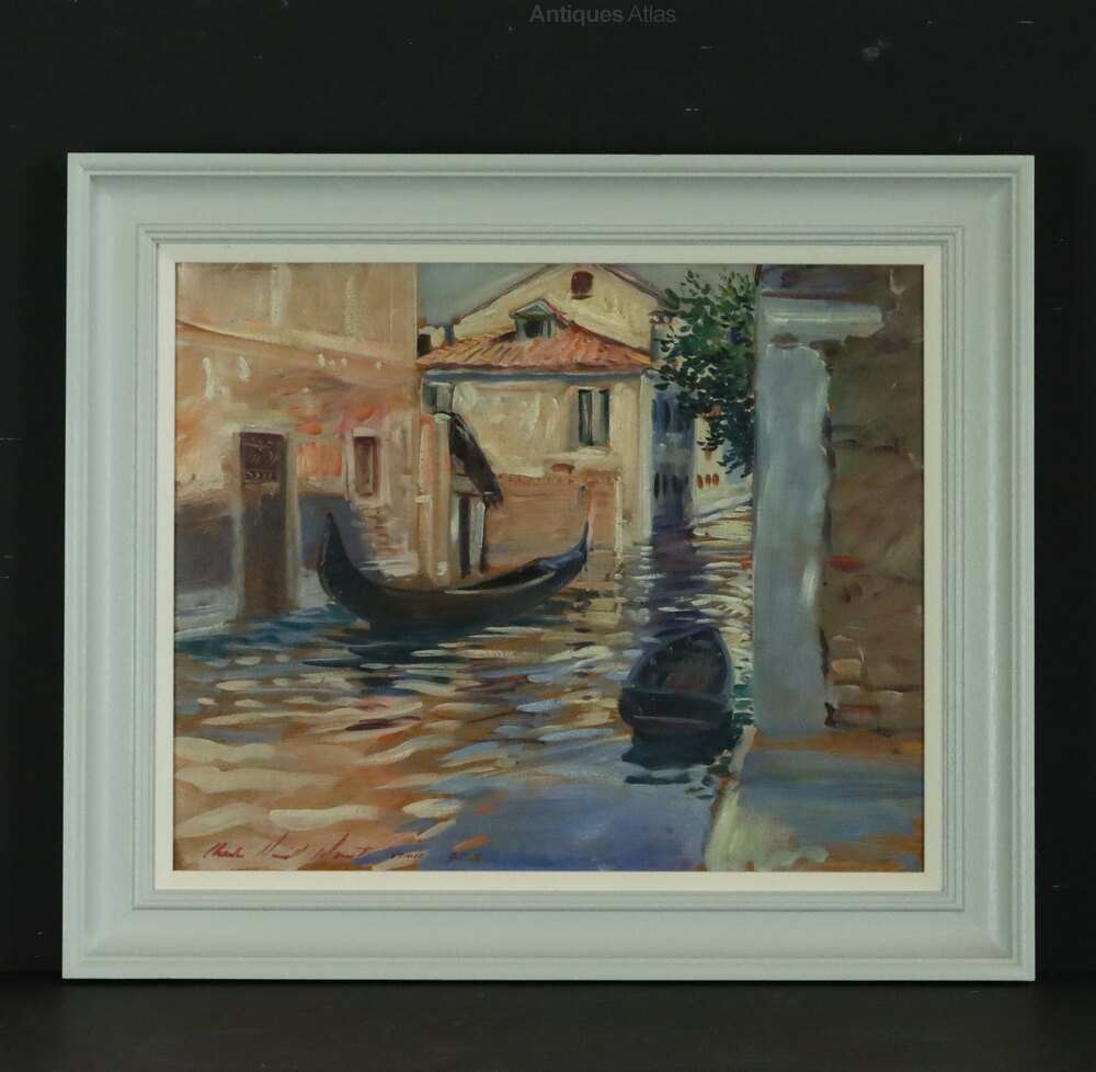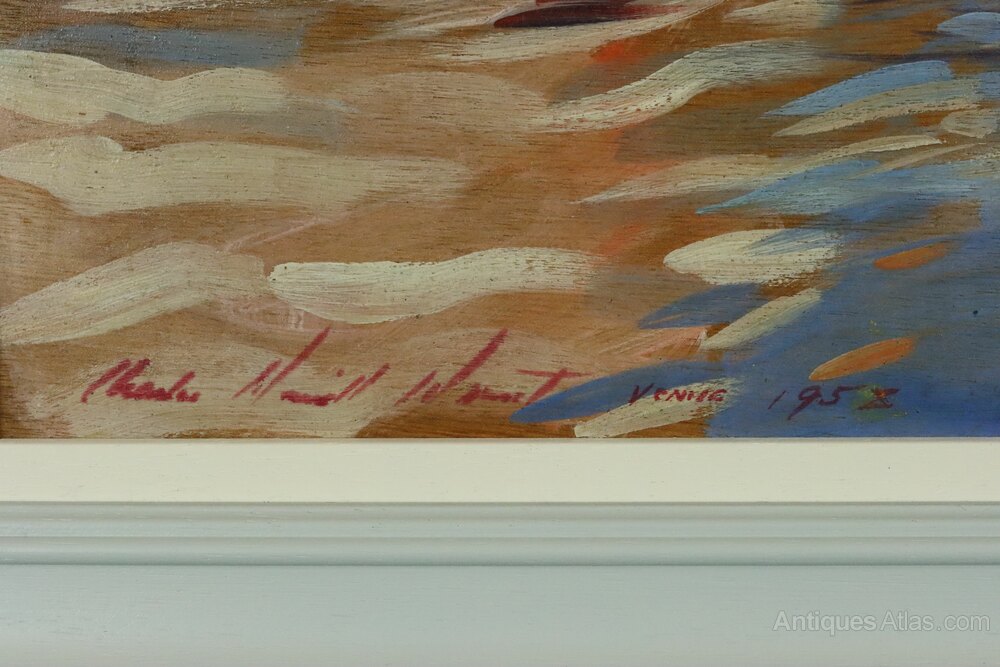 A fine mid-century post-impressionist style oil on board painting of a Venetian canal with gondolas by the American artist Charles Merrill Mount (1928 - 1995), signed and dated 1958. Mount has a good record of works sold on the secondary market, particularly in the USA, with prices usually in excess of $1000. The label on the reverse for Combridge Ltd, Fine Art Dealers and Picture Framers , based at 18 - 20 Grafton Street and 1a Duke Street, Dublin neatly ties in with Mount's move to Ireland in 1961 where he married and fathered four children. By the end of the 60s he had separated from his wife and returned to New York City.Dimensions: Frame - 49 x 57.5 cm, Frame thickness 4.5 cm