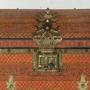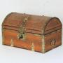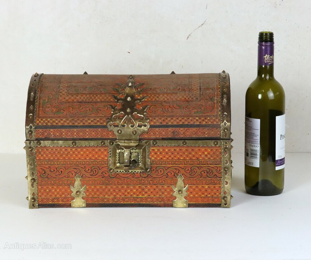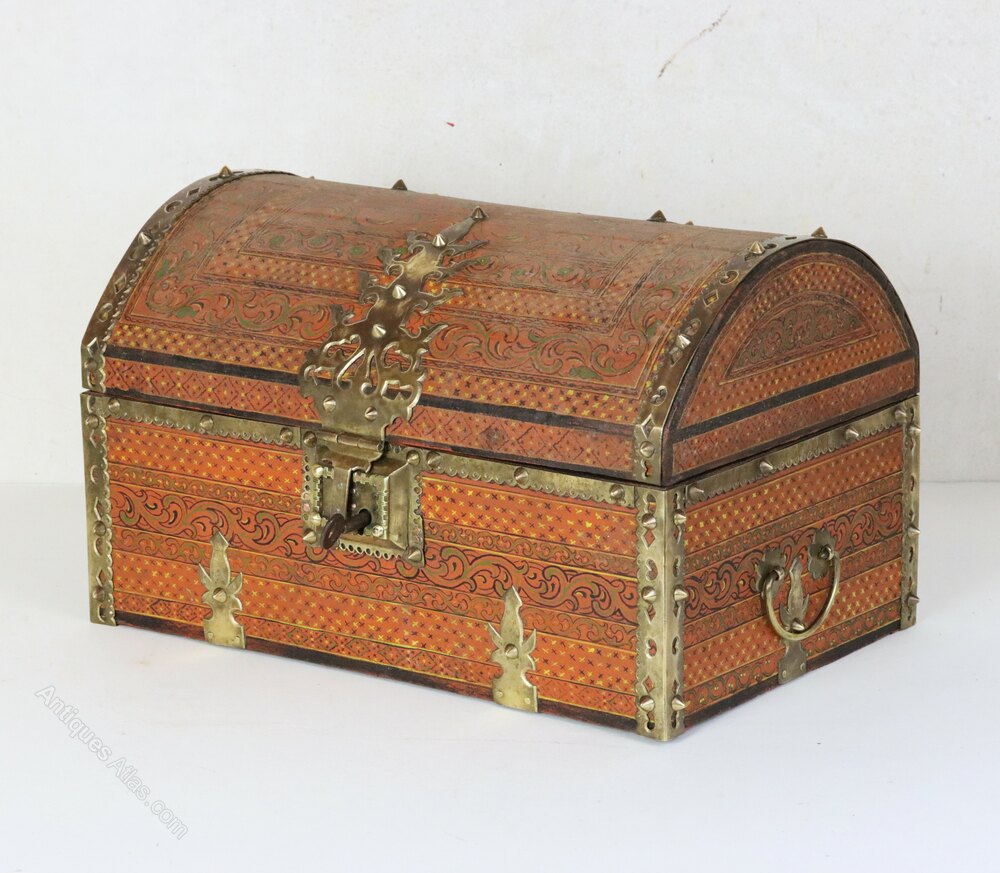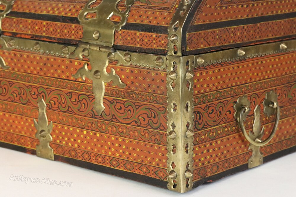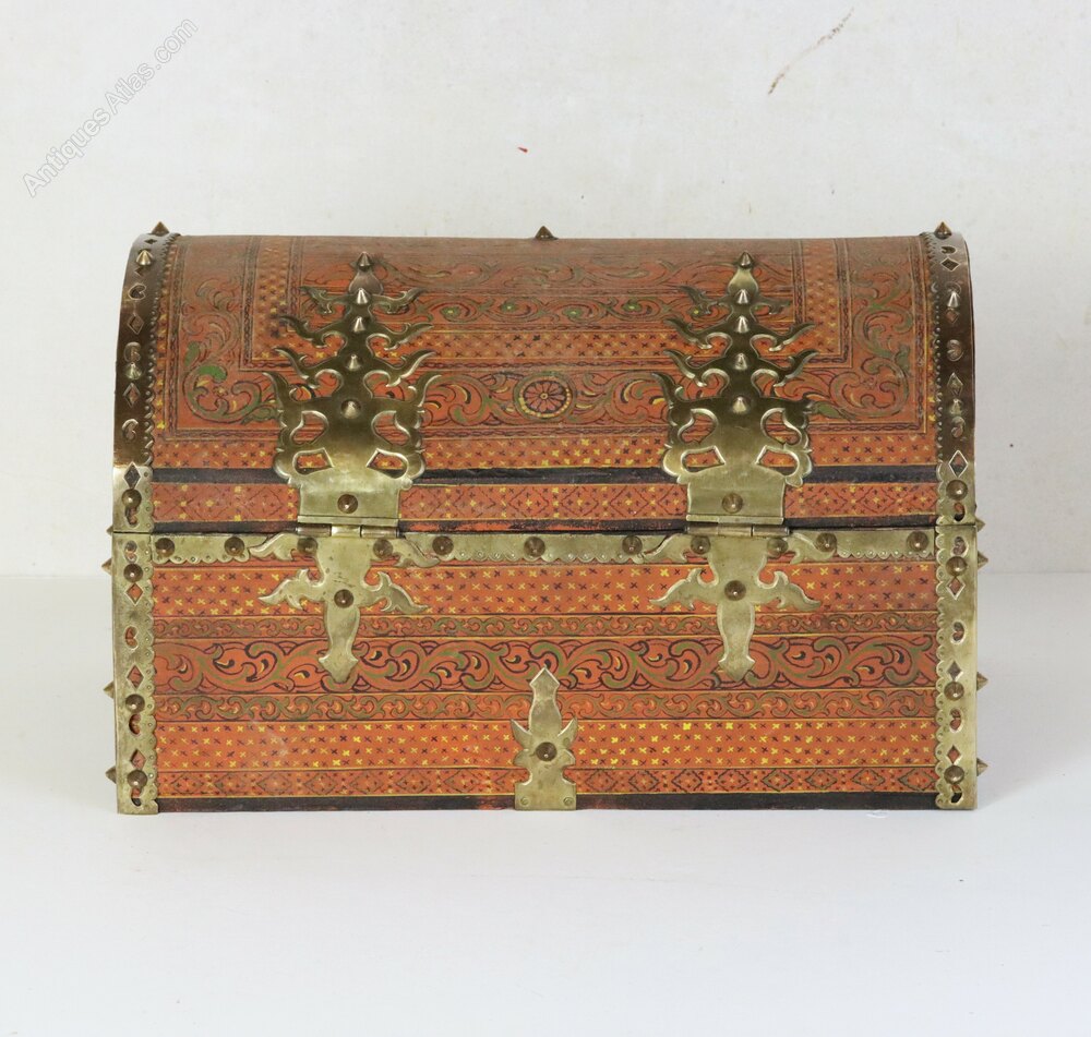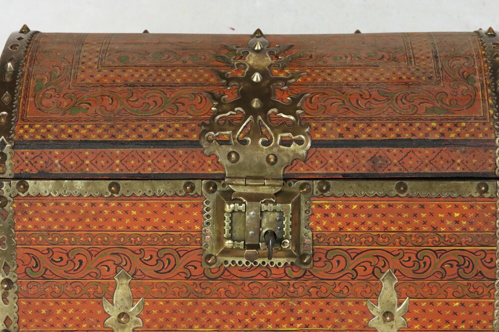 An antique Indian domed-top painted wooden wedding dowry box or small table-top chest with very decorative brass mounts. This beautifully crafted box was made in Kerala in South India in the early 20th century.It is perfect for storing jewellery or for other precious items.