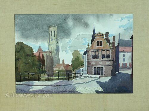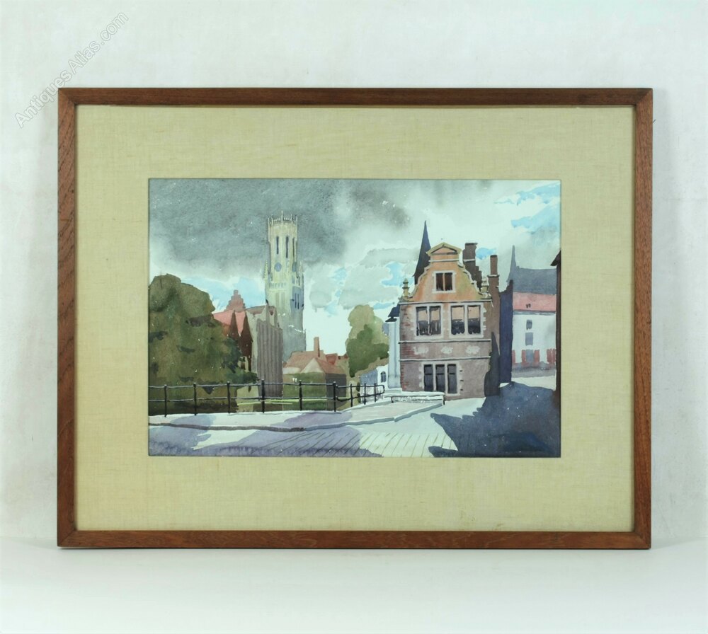 A mid century oak framed watercolour of a view of Bruges by well known 20th century artist, Charles Knight R.W.S R.O.I.Dimensions: watercolour 37 x 54cm frame TBA