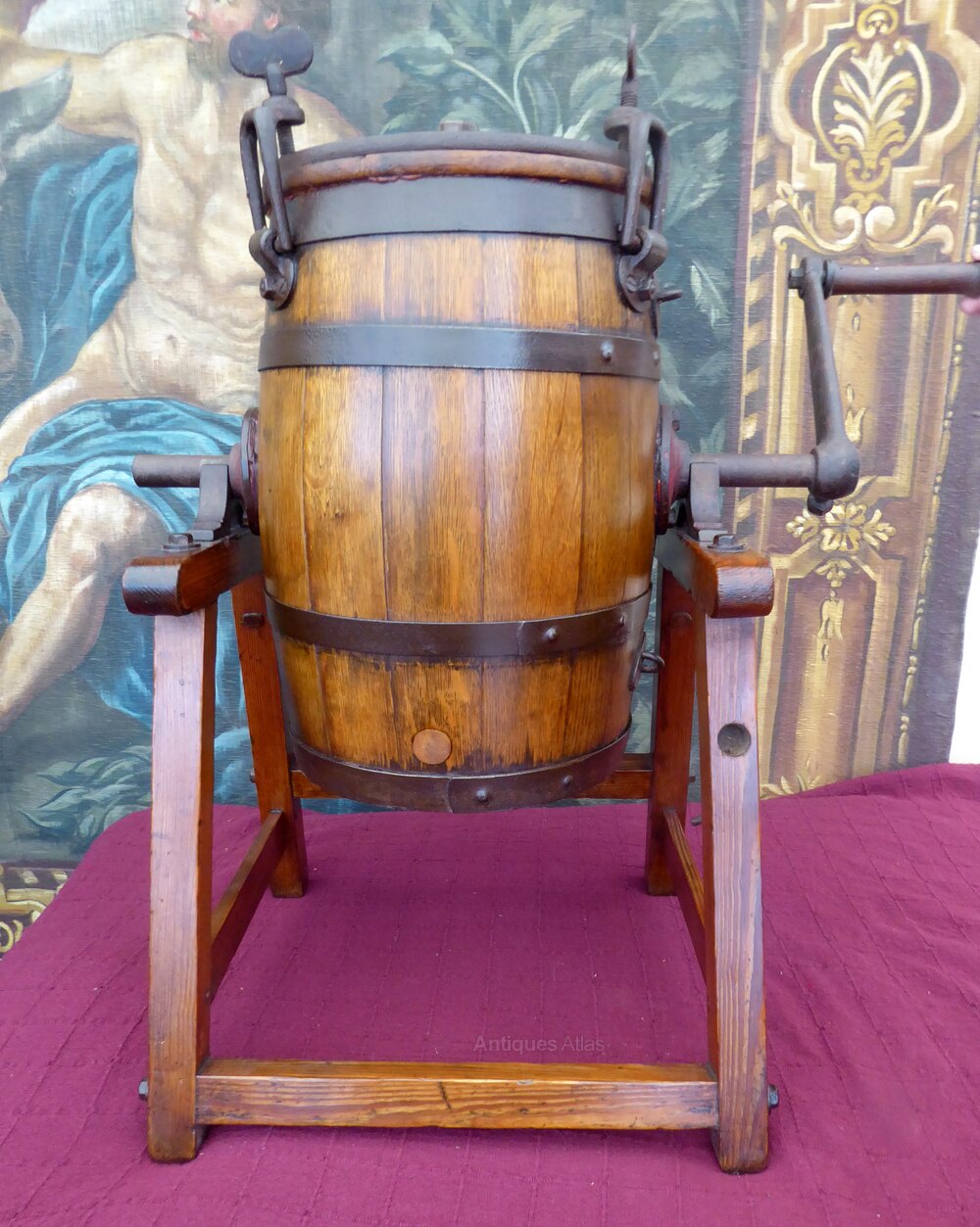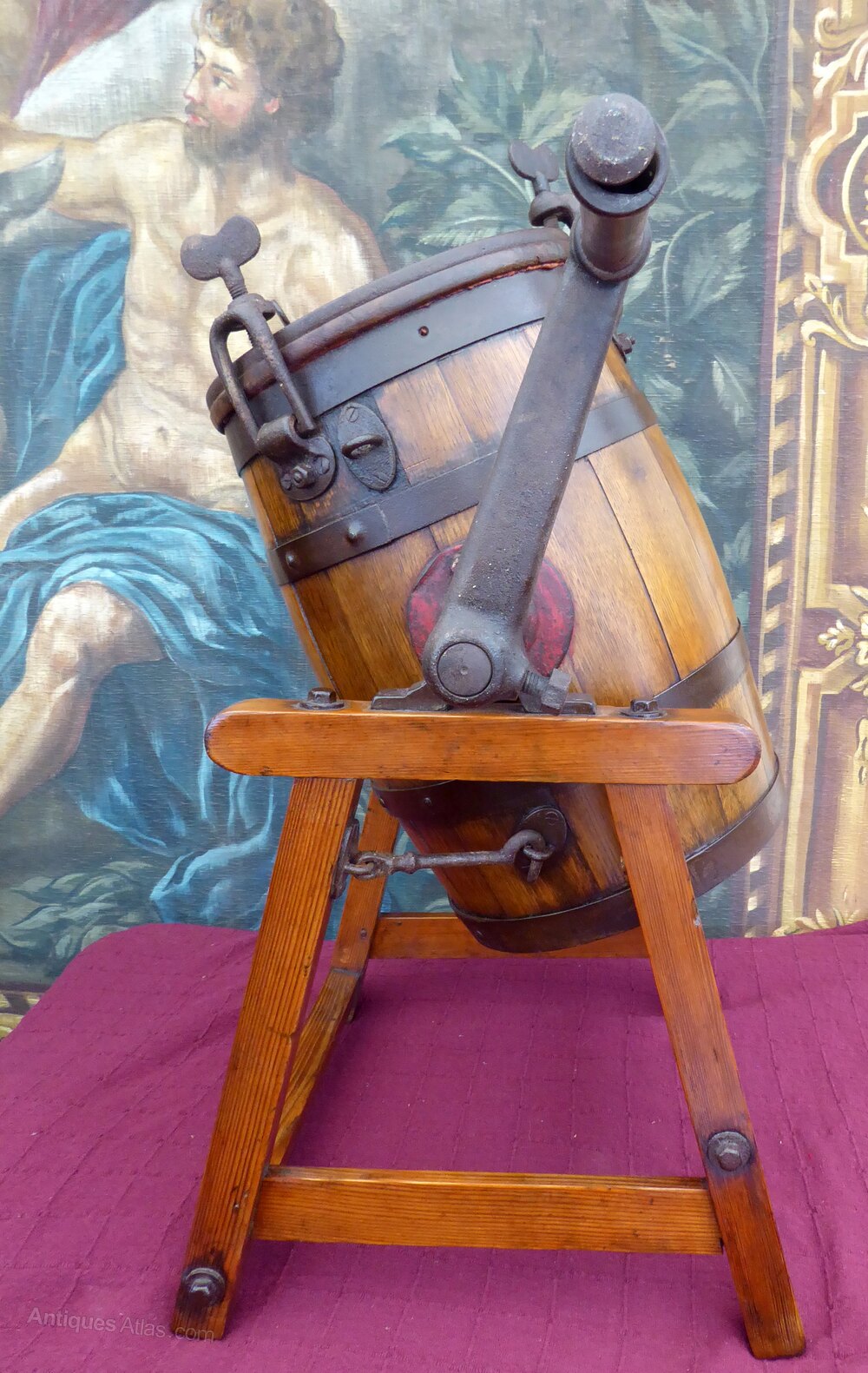A wonderful antique butter churn on standDates 1860-1880
