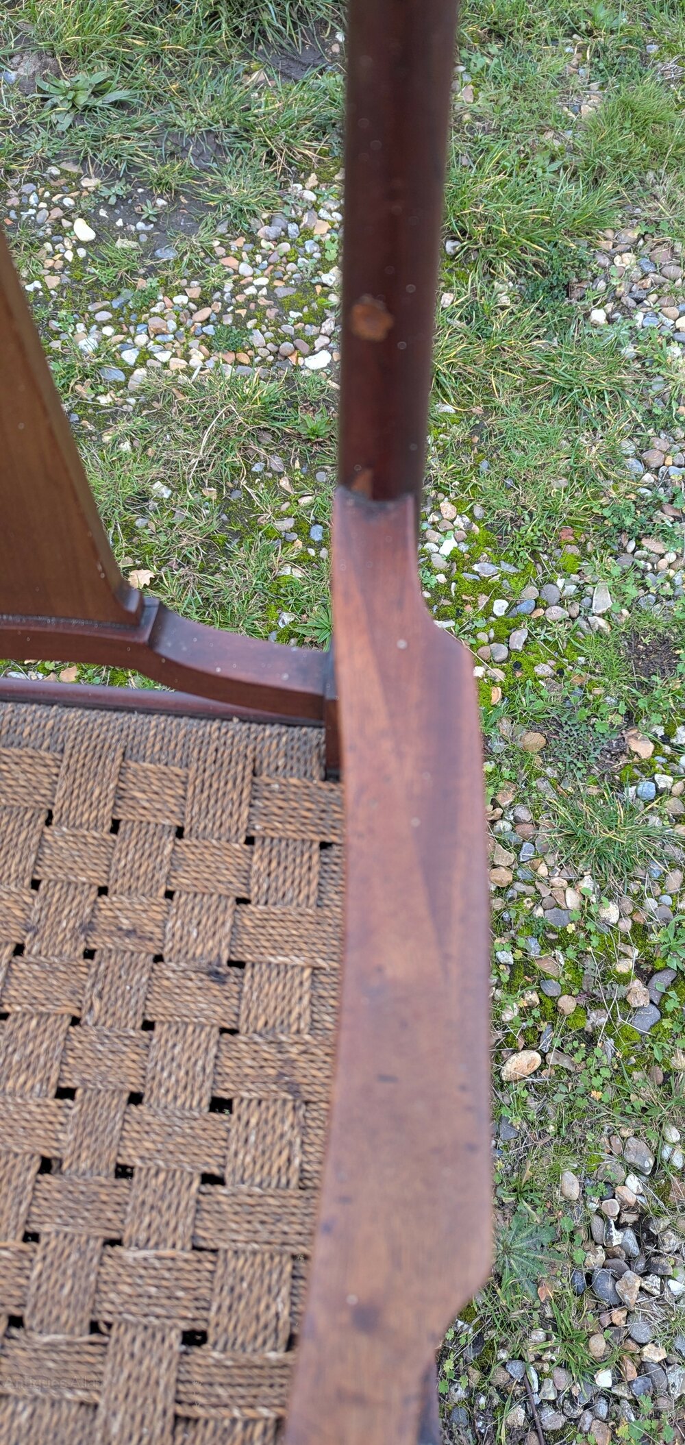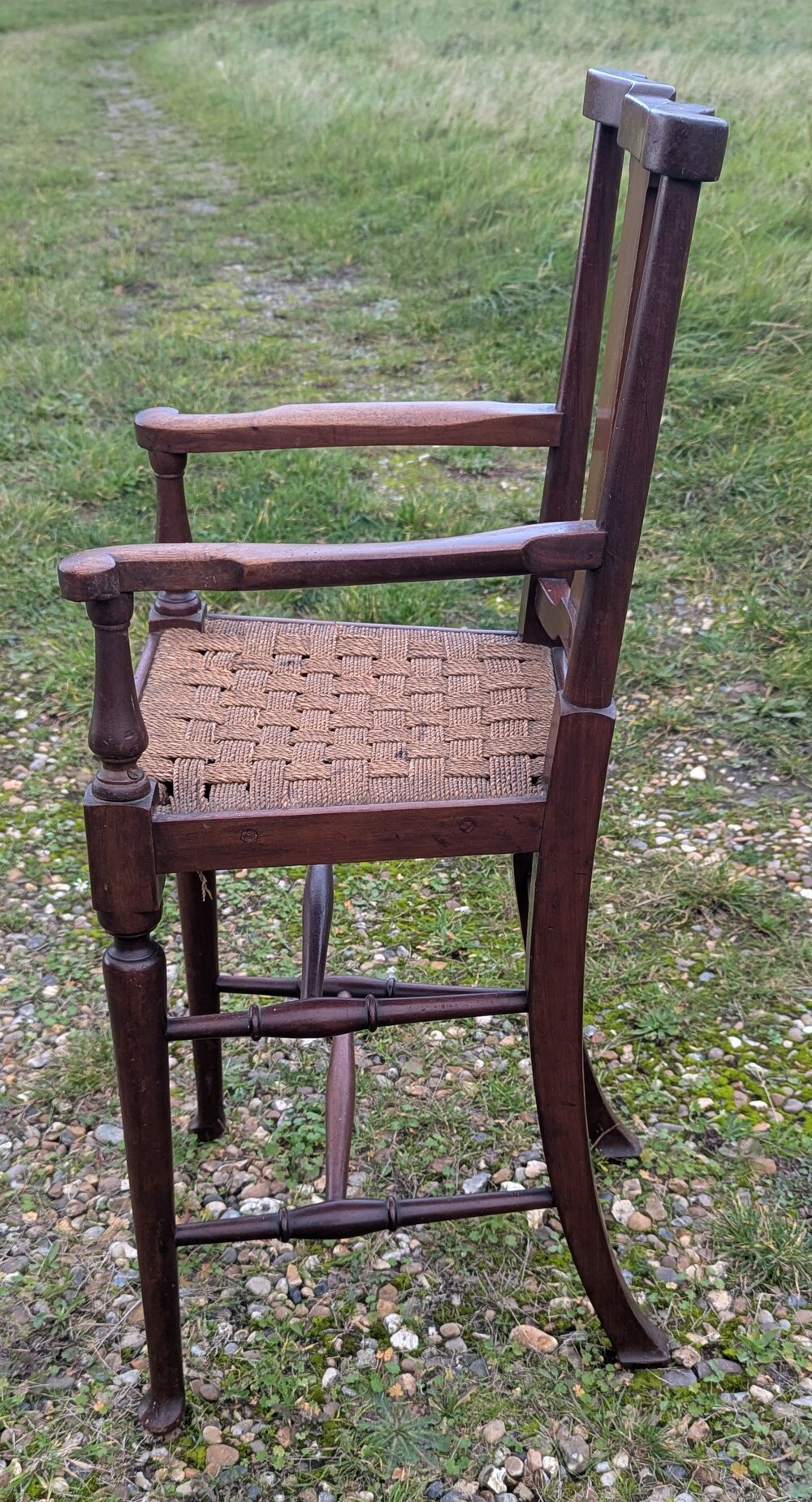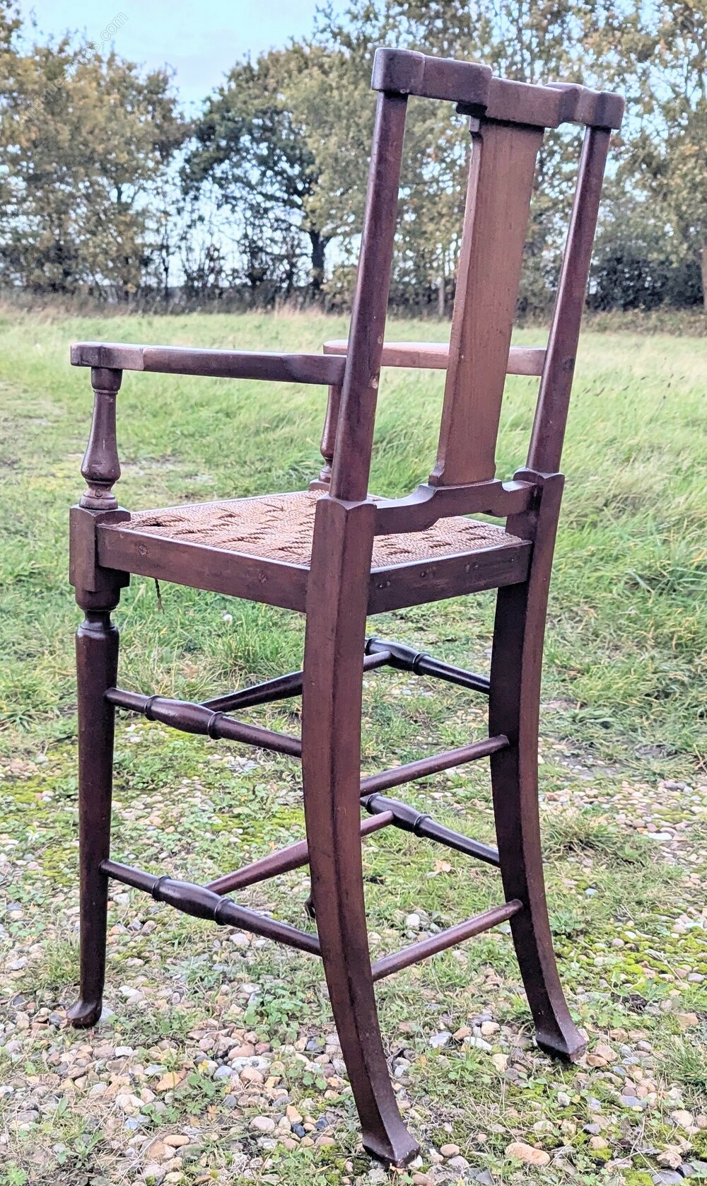 A rare mahogany Morris & Co child's highchair having had historic repairs and needing further restoration. It measures 39 cm x 41 x 95.DateArts and Crafts