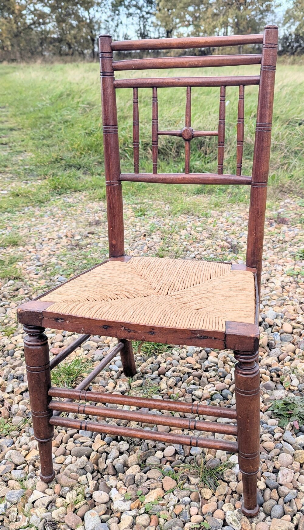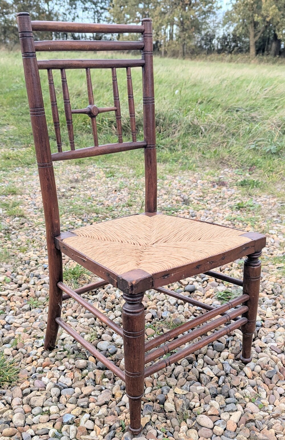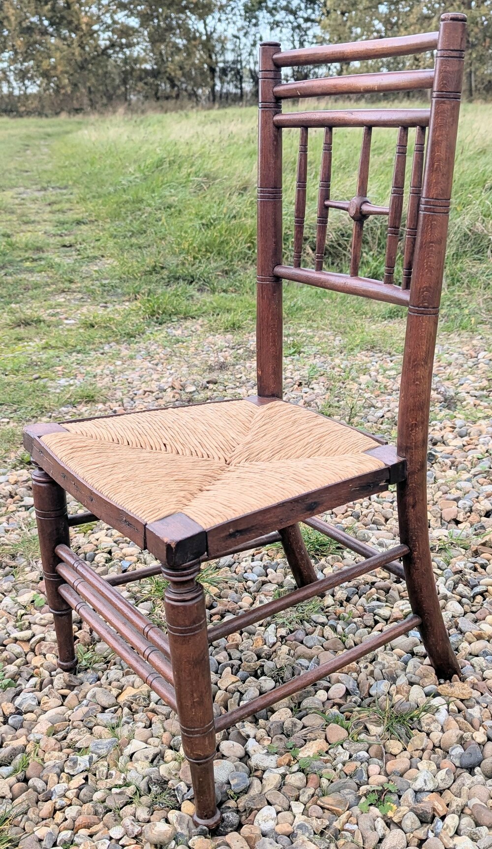 A Morris & Co beech rush seated childs chair in good used condition measuring 36 cm x 36 x 70.DateArts and Crafts