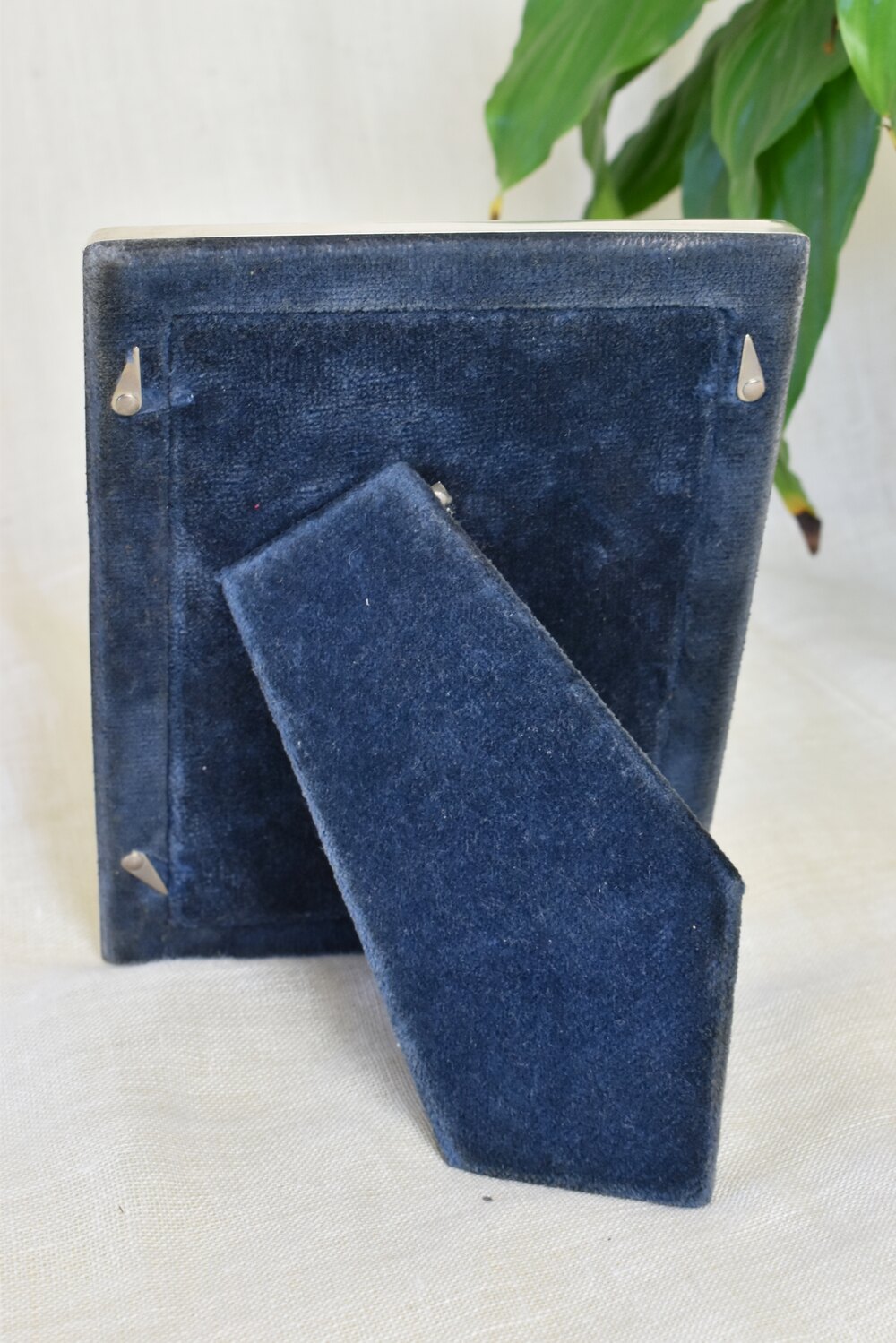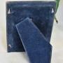 The back of the frame is covered in a blue fabric and is removable to mount your picture. The frame can be placed in portrait or landscape orientation.