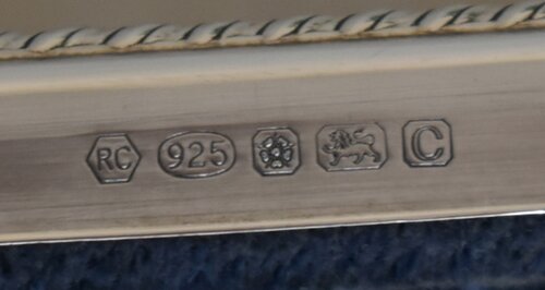 A nice sized Sterling silver picture frame marked with the lion passant confirming it is 92.5% silver with the date letter "c" for 2002 assayed in Sheffield denoted with a Tudor rose and stamped with the makers mark RC within a hexagon which I think is R. Carr Ltd of Sheffield.The outer edge of the frame has very delicate decoration and is glazed to the front.