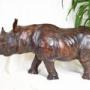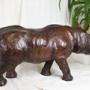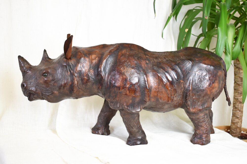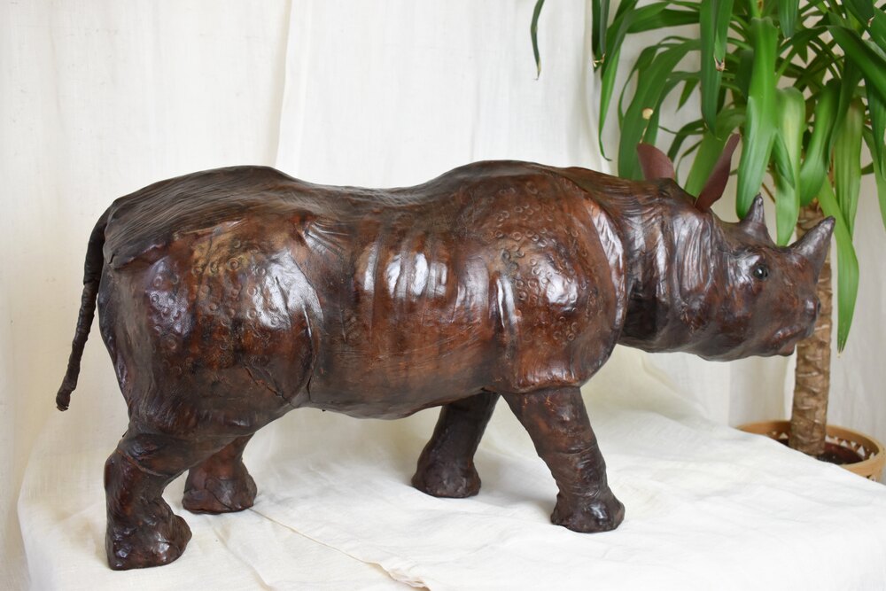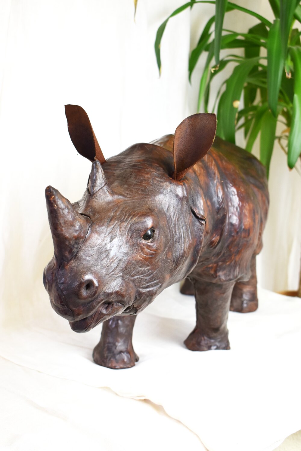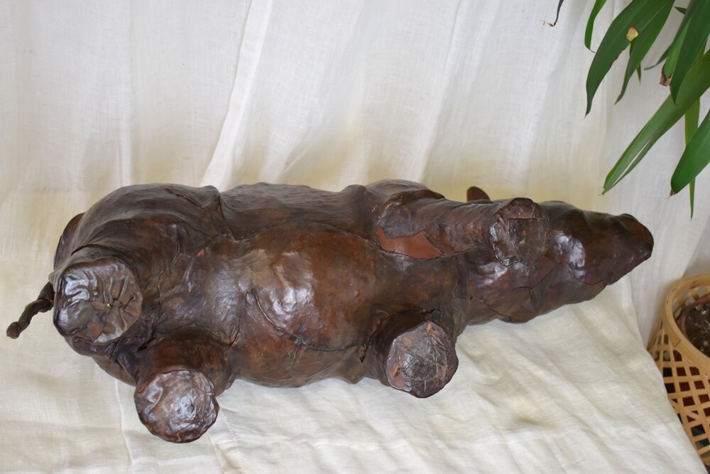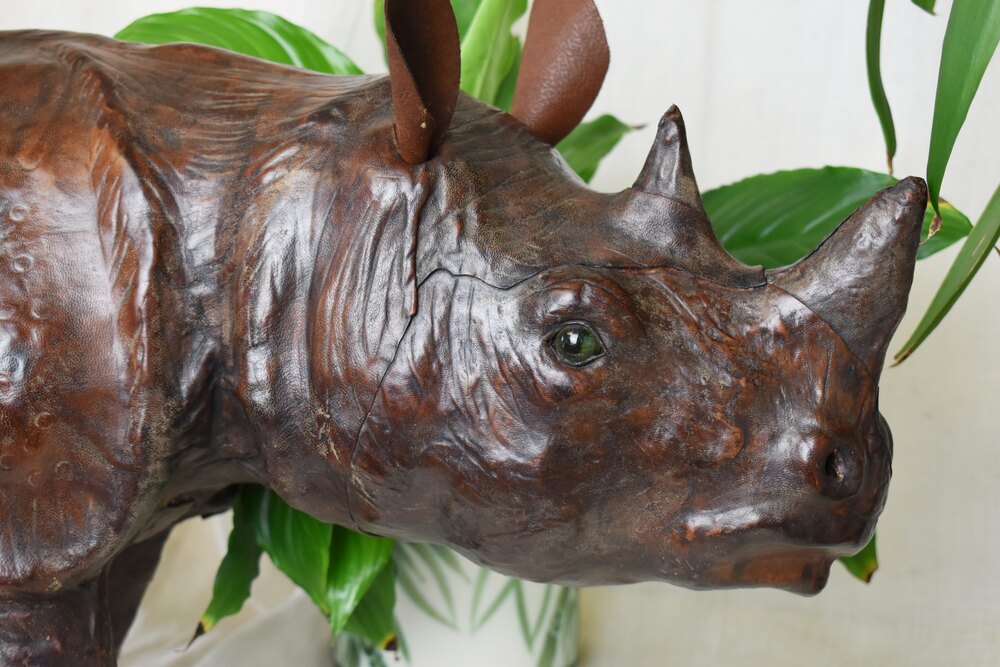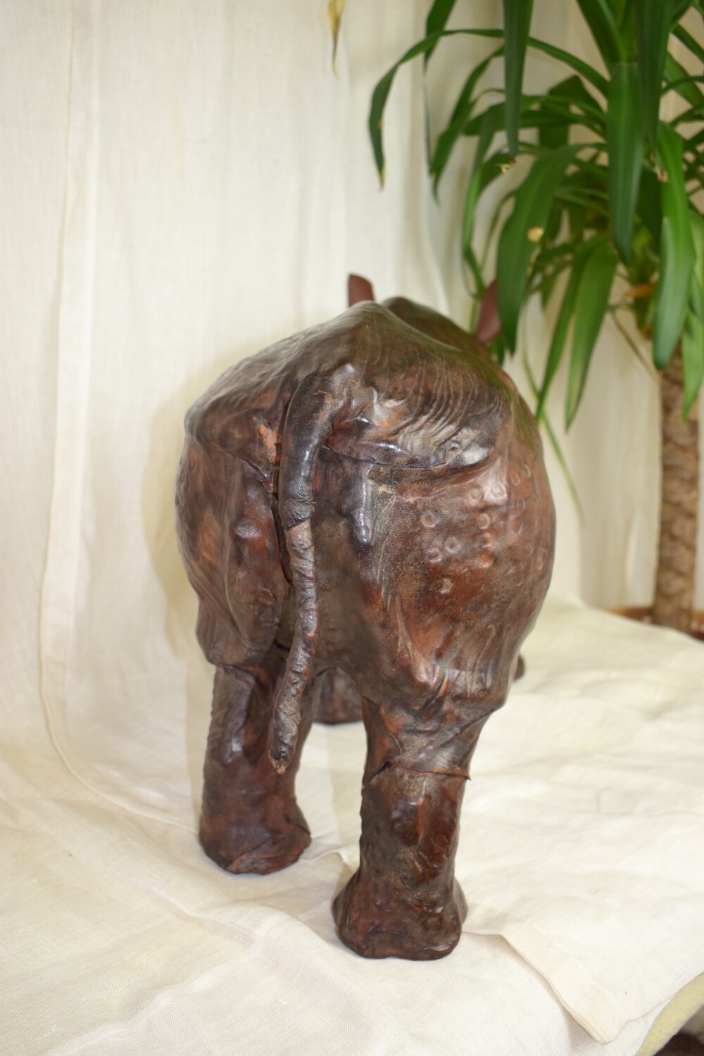 Wonderful example of a leather foot stool circa 1900's. Made of leather stretched over and stuck to a frame. Great colour and patination. The leather has been sculpted into shape and textured to give a very realistic rhinoceros appearance. Unusually the original tail is intact as are the green glass eyes. The ears are replacements.T.S.Baskett