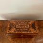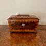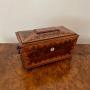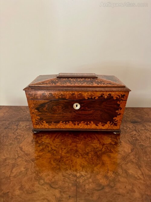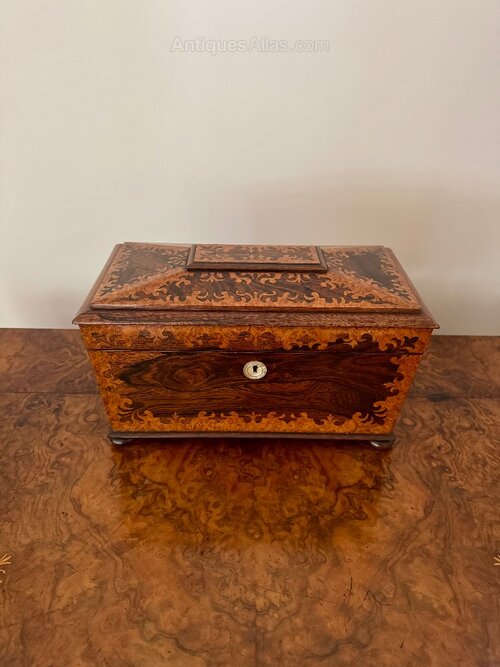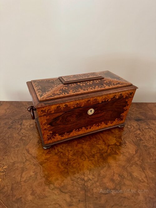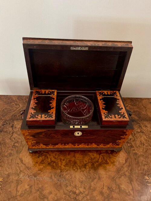 Outstanding quality antique Victorian rosewood and burr maple tea caddy, having a quality antique Victorian tea caddy of sarcophagus form with beautiful swirling floral motifs along the borders, the hinged cover opening to reveal a central glass mixing bowl flanked by two removable containers with swirling detail for black and green tea, having ring handles to the sides, raised on squat bun feet.H 21cm