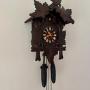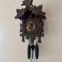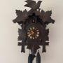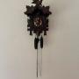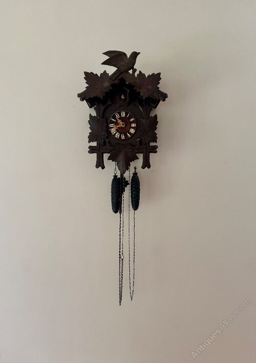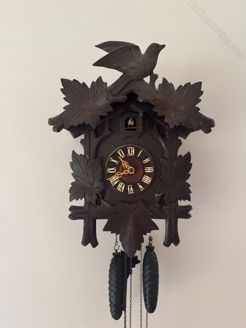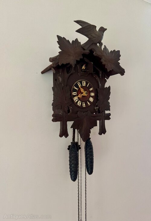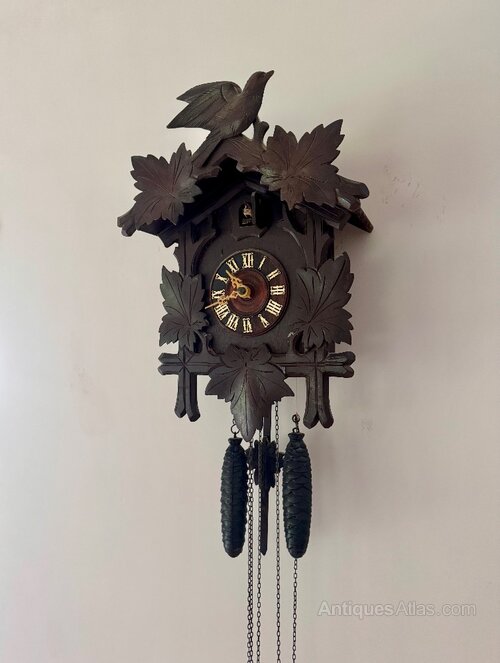 Quality antique Black Forest cuckoo clock, having a quality traditional antique cuckoo clock decorated with carved leaves and a bird to the top and leaves to the sides of the circular dial with white Roman numerals and the original ornate hands, above the dial to the centre is a small door that the cuckoo emerges from to chime the hours, having a carved leaf pendulum and two original pinecone shaped weights attached to chains to drive the clocks movement and the cuckoo mechanism.H 46cm