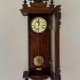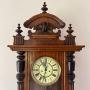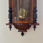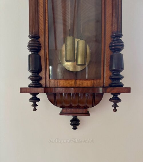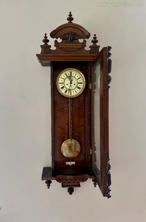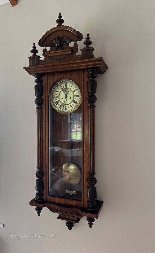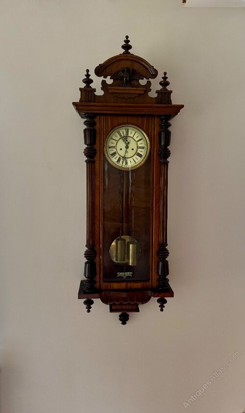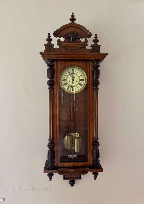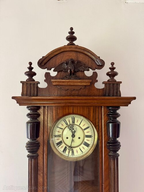 Fine quality antique Victorian carved walnut Vienna double weight wall clock, having a quality carved walnut case with reeded turned columns, having all the original finales, fantastic shaped top with a carved eagle finished with a carved finale to the top and a shaped bottom, having a single walnut glass door opening to reveal a circular dial with Roman numerals, with the original hands and key, having an eight day movement striking on the hour and half hour on a gong, having the original two brass weights and brass pendulum.H 94cm
