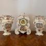 Lovely quality antique late 19th century porcelain mantle clock garniture set, having a shaped mantle clock with a circular dial with Roman numerals and the original hands with a brass bezel, having an eight day movement striking on a bell, decorated with classical figures within panels surrounded by pretty flowers in red, blue, yellow and green colours, with the matching side urns with matching decorations on shaped gilded bases, one vase has had minor restoration to the top.This is a Crown Devon garniture stamped to the base as shown.