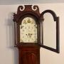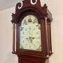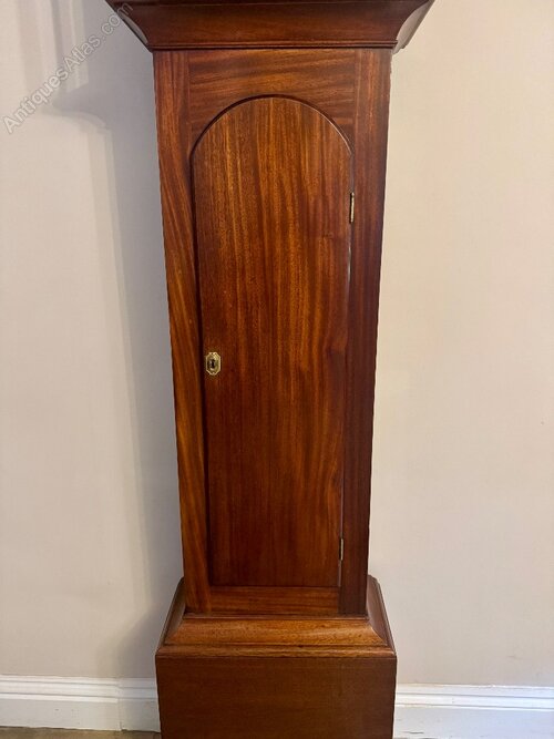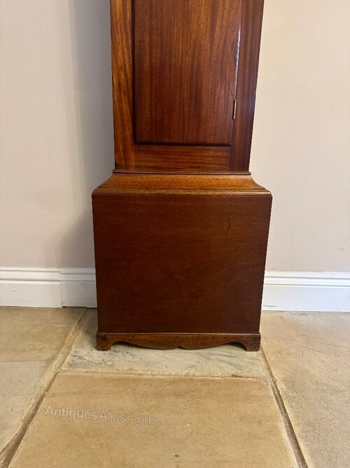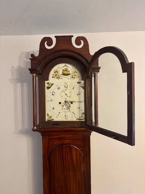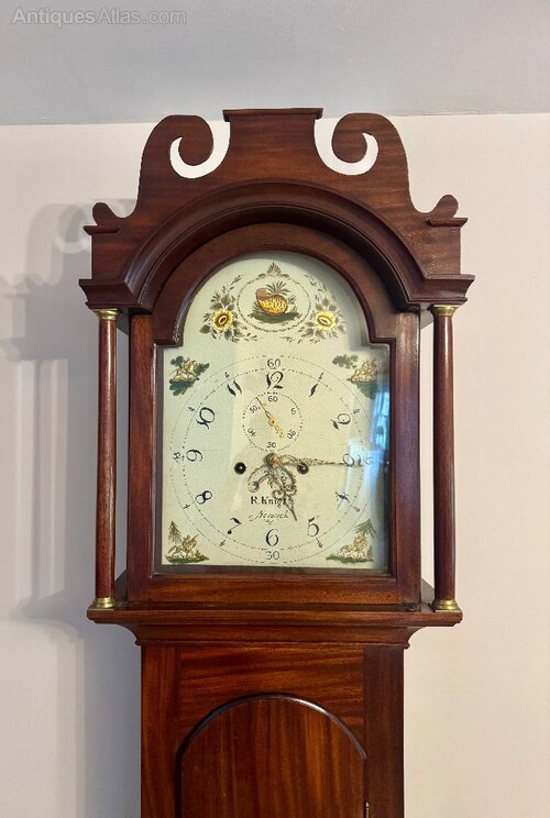 Fine quality antique George III mahogany longcase clock, having a distinctive swan neck pediment with carved scrolls and a central flat section above a arched painted dial decorated with floral and fruit motifs above a circular dial with black Arabic numerals with ornate brass hands, the dial is signed R. Knight Norwich, with a eight day movement striking on a bell with the original pendulum and weights, having a quality mahogany trunk with a long central arched door with a brass key hole, standing on a rectangular plinth base.H 220cm