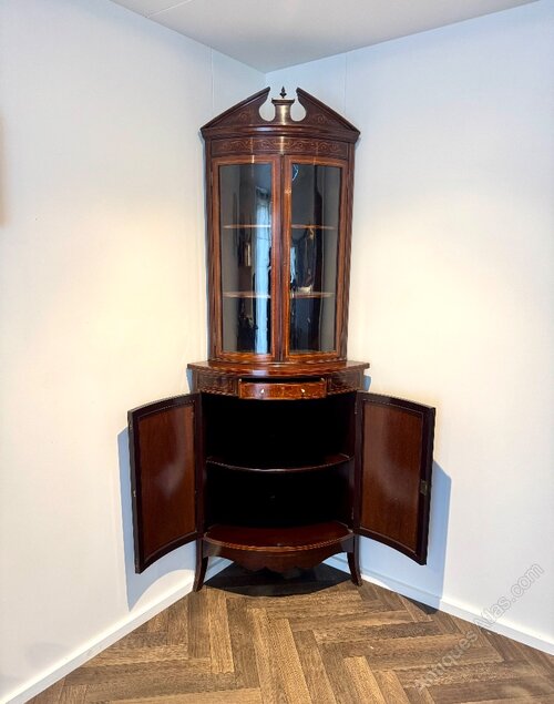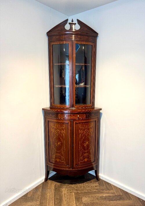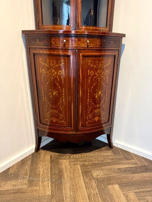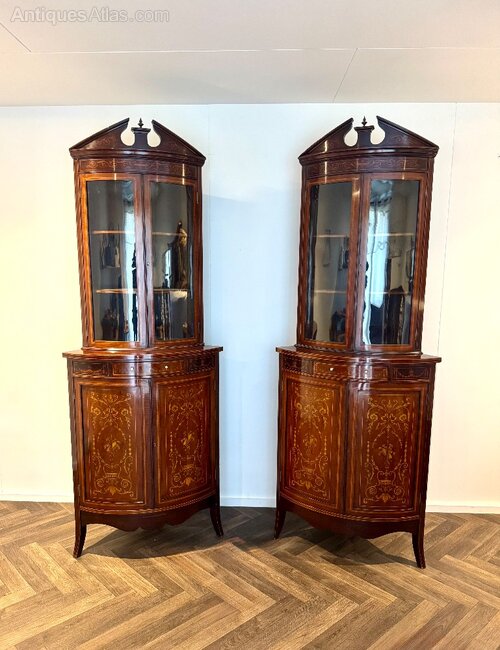 Antique Mahogany Marquetry Inlaid Corner Cabinets