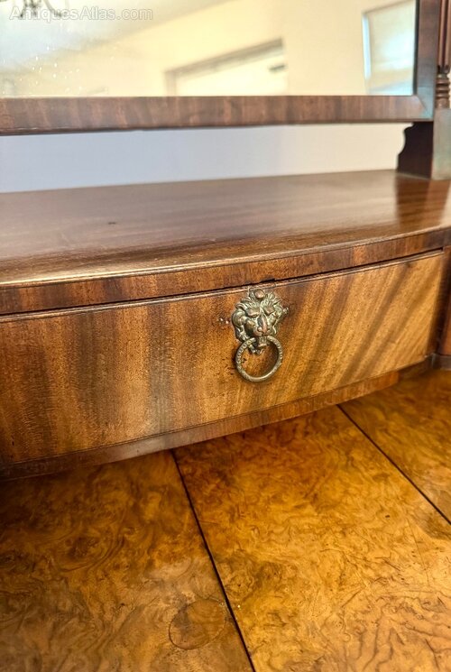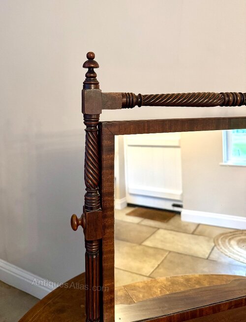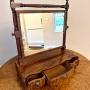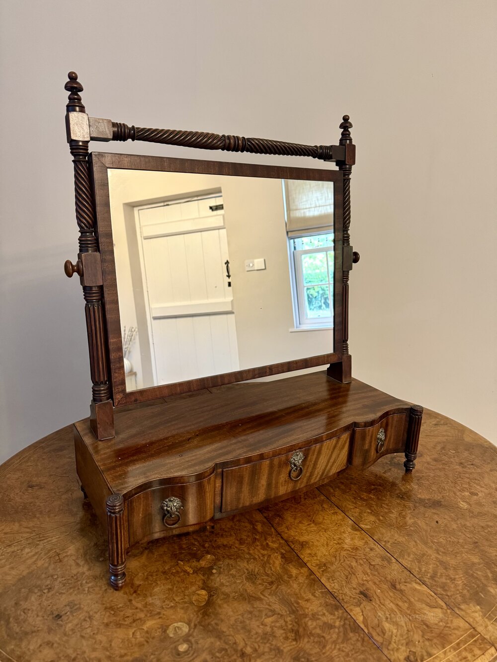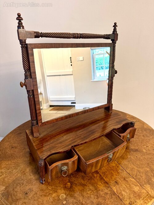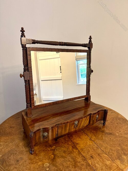 Fine quality antique Victorian mahogany swing mirror, having a quality antique Victorian rectangular swing mirror with turned wooden supports featuring spiral carvings enabling it to tilt forward and backwards to your desired position with a serpentine shaped front with three drawers and the original brass lion ring handles raised on shaped feet.H 68cm