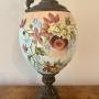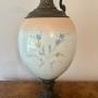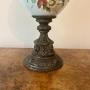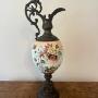 Unusual large antique Victorian ewer, having a ornate detail shaped handle with a seated cherub to the top above a shaped spout above a glass bulbous body hand painted with pretty floral detail in red, yellow, green and blue colours on a peach and white ground above a ornate shaped base.H 67cm
