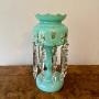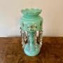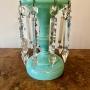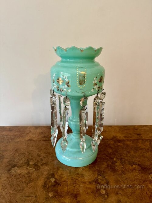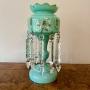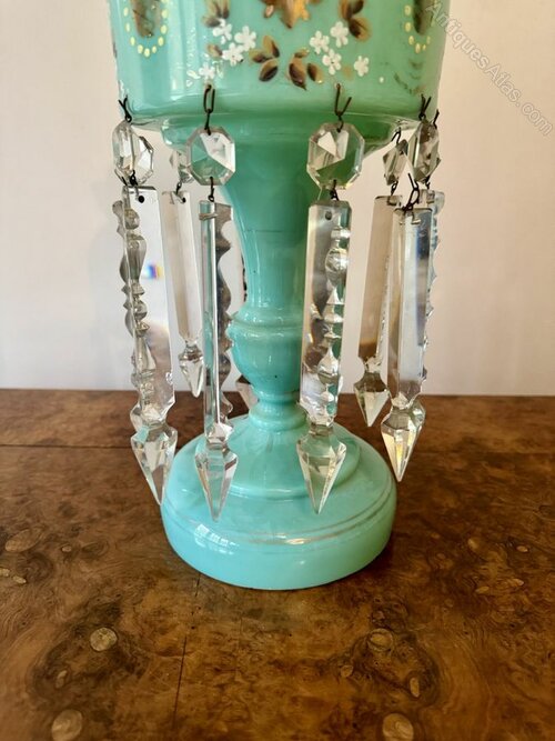 Pretty quality large antique Victorian turquoise glass lustre having a castellated top to a baluster bowl decorated with pretty flowers & leaves hand painted in white and green colours with gold gilding detail, having the original hanging prismatic clay glass drops.H 38cm