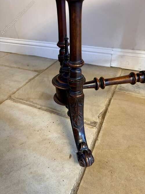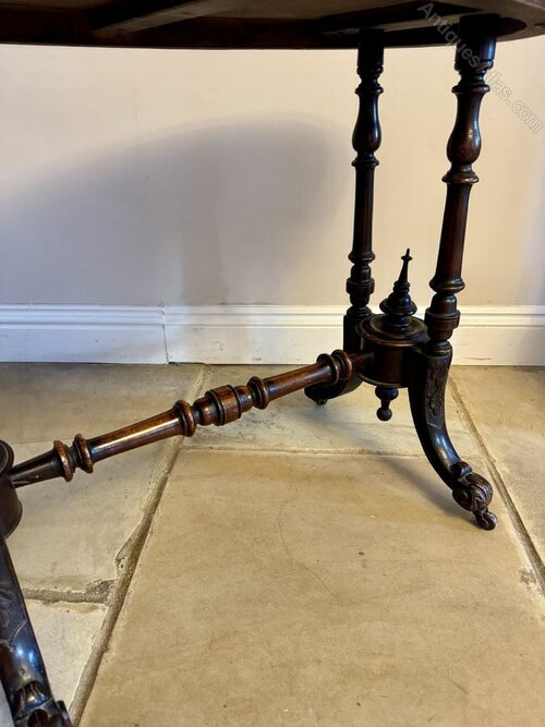 Fine quality antique Victorian burr walnut inlaid oval occasional table, having a quality antique Victorian occasional table with a beautiful burr walnut polished oval shaped top decorated with inlaid motifs to the edges with urn and scroll detail united by a triple line inlay above two carved supports, turned central column with intricate carved detail united by a turned stretcher raised on carved feet with the original castors.H 70cm