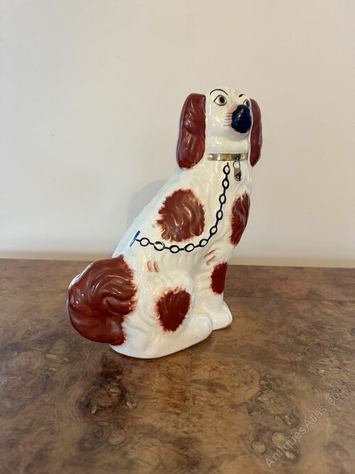Attractive pair of antique Victorian Staffordshire dogs, having a quality pair of antique Victorian Staffordshire dogs, with matching white coats with brown spots, matching gold collars with black chains in a seated position.H 28cm