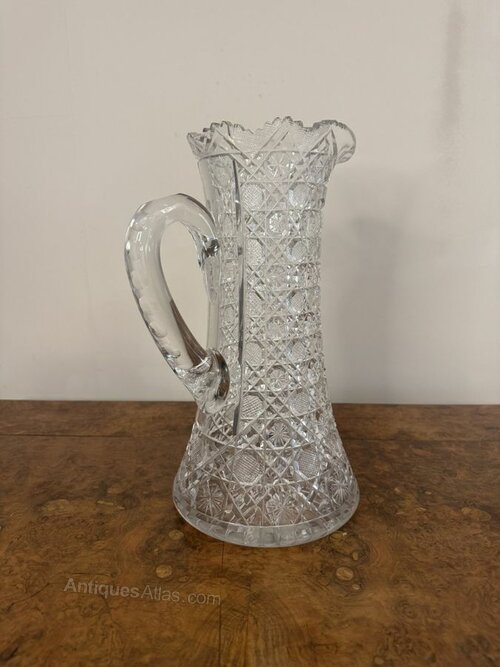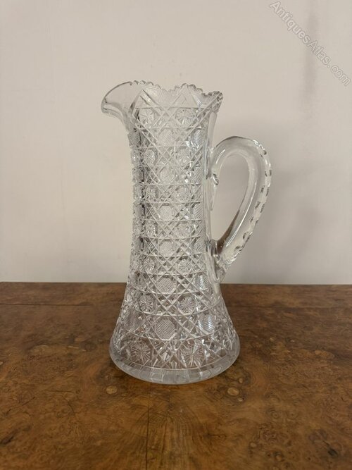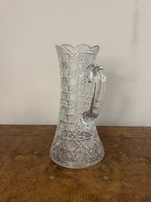 Outstanding quality large antique Edwardian cut glass jug, having an outstanding quality cut glass large jug with geometric cut patterns with diamonds, cross hatching and circular starburst motifs, having a flared shaped body, a scalloped edge, shaped pouring spout and a curved shaped handle to the back.H 36cm