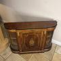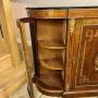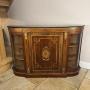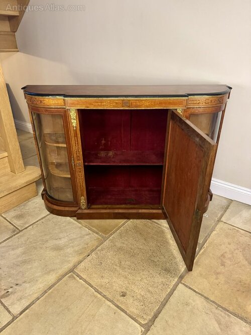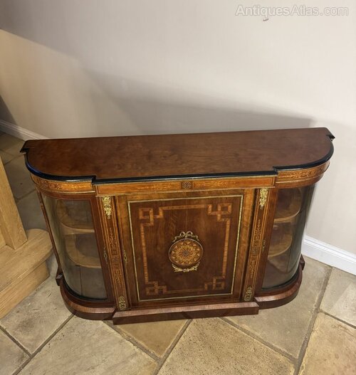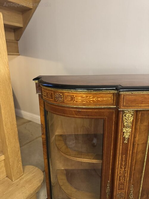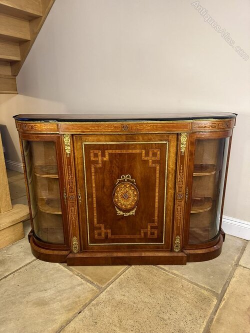 Outstanding quality antique Victorian walnut inlaid credenza, having a quality richly polished walnut inlaid antique Victorian breakfront credenza, with a quality walnut moulded shaped top with an ebonised moulded shaped edge above a central door decorated with intricate marquetry detail featuring a circular patterned motif framed by geometric inlay and ormolu mounts, opening to reveal a red velvet interior with one shelf, flanked by a pair of bow fronted glazed doors with two shelves, raised on a walnut plinth shaped base.H 98cm