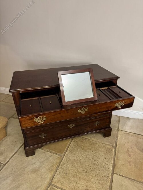 Excellent quality antique George III mahogany gentleman's chest, having a quality antique George III gentlemen's chest with four long drawers with ornate brass handles, the top drawer opening to reveal a fitted interior with a folding mahogany framed mirror to the centre surrounded by fitted compartments, raised on bracket feet.H 88cm
