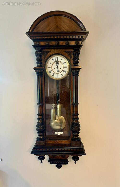 Fantastic quality antique Victorian Rosewood double weight wall clock, having a quality antique Victorian double weight wall clock, with a quality rosewood & ebonised carved case, having an arched shaped top above a row of beautifully carved floral assets, above a single glazed door flanked by twin carved columns casing a 7inch white enamel dial with black Roman numerals and black ornate hands, having an eight day movement striking on a gong with the original circular drop down brass pendulum, finished with a quality rosewood carved base with ebonised detail.Good condition with the original winding key.
