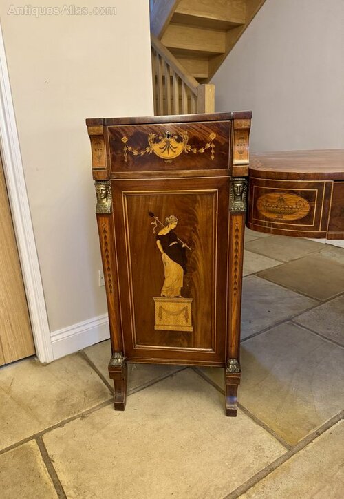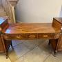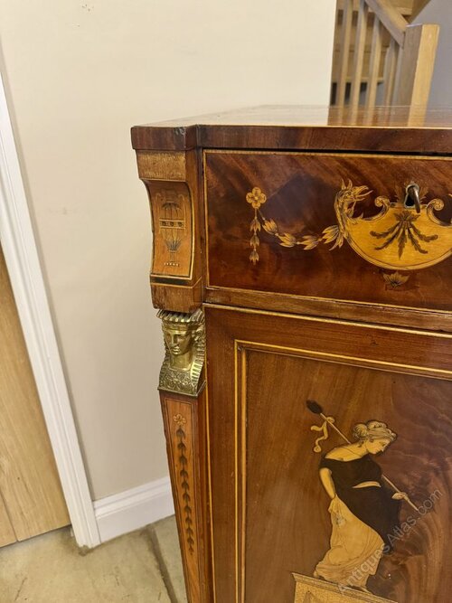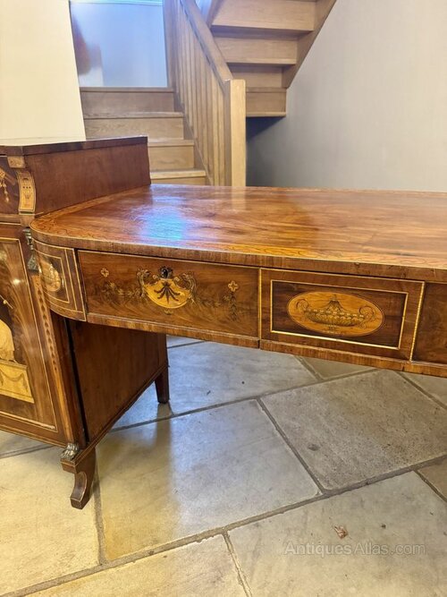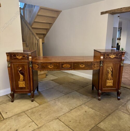 Outstanding quality large George III mahogany & satinwood inlaid sideboard, having a large figured mahogany sideboard with stunning Neo classical marquetry inlaid satinwood panelled doors to the pair of pedestal cabinets flanked by brass spinx heads, connected by a long central writing surface above two inlaid drawers with floral and urn detail, standing on sabre legs.Fine quality George III original sideboard in good condition.