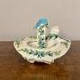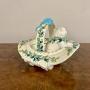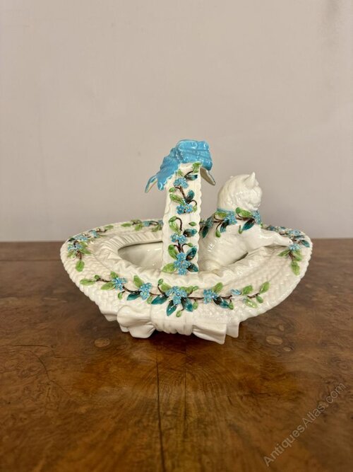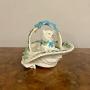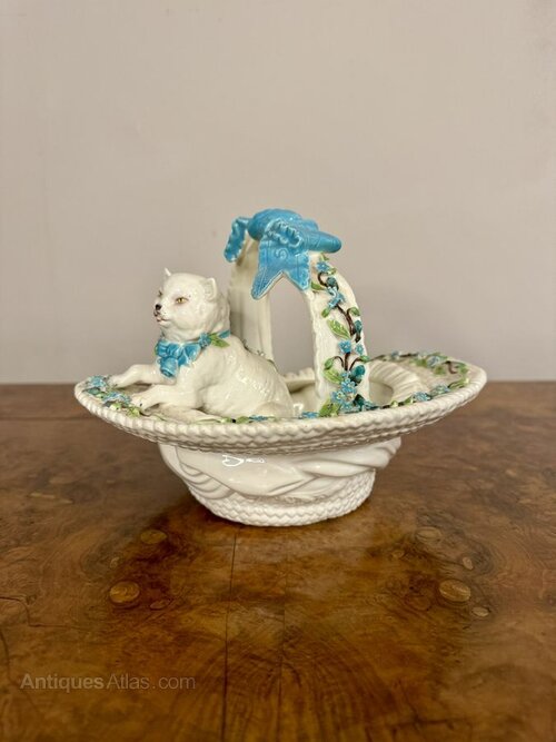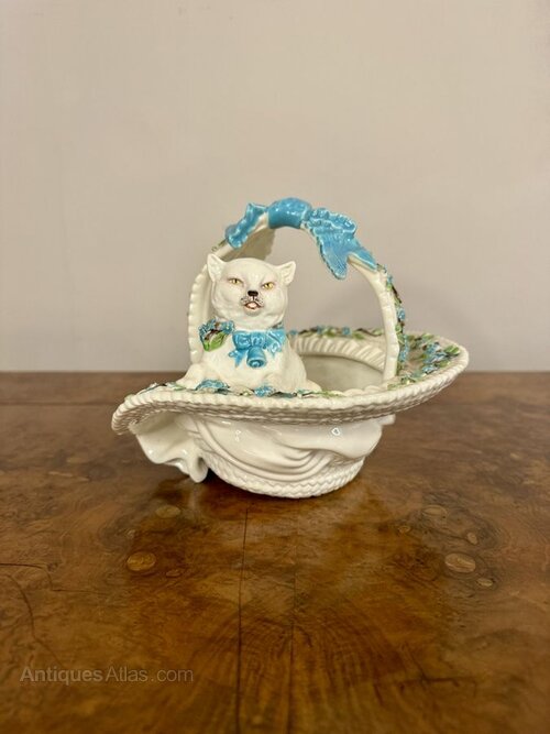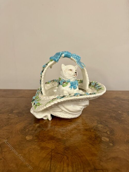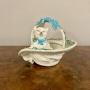 Pretty quality antique Victorian porcelain basket, having a quality white cat with a blue bow in a seated position sitting in an upside down bonnet decorated in encrusted forget me-nots finished with a matching blue bow central to the handle, hand painted in beautiful blue, green and white colours.Victorian registration lozenge verso.