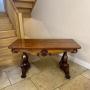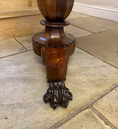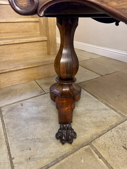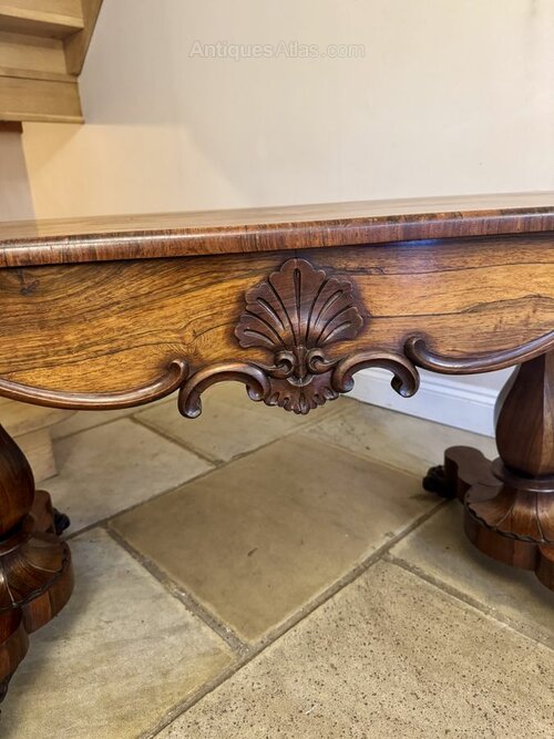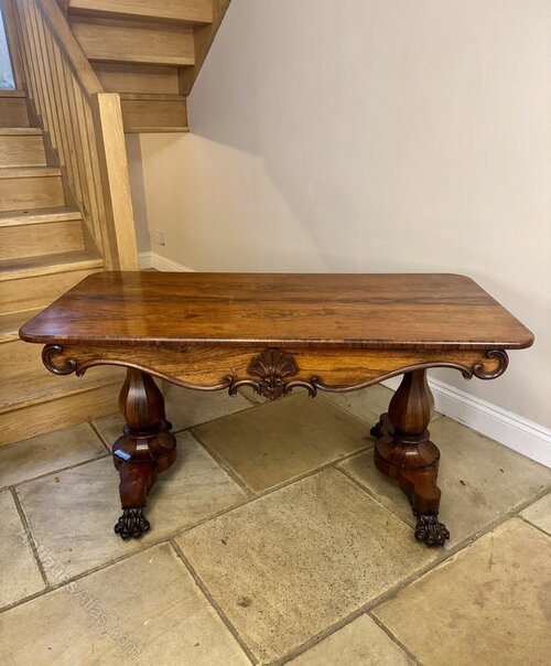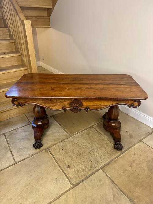Fine quality antique regency rosewood centre table, having a quality antique rosewood centre table with a quality rosewood polished rectangular top with rounded corners, above an apron with ornate carved detailing with a central shell motif and curved scroll work opening to reveal a single long drawer, above two turned pedestal legs each finished with fantastic carved claw feet.H 72cm
