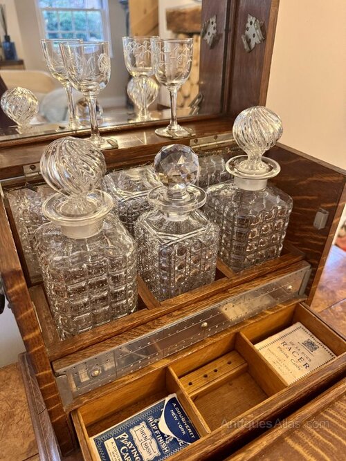 Outstanding quality antique Victorian oak decanter and games box, having an outstanding quality oak case with ornate metal mounts and two carrying handles to the sides, having a lift up lid opening to reveal a mirrored back and fitted interior with two glasses and three cut glass decanters above a games section containing cards and a playing area with a pull out drawer & an ornate handle.Fantastic quality in original condition with a Bramah London lock.