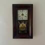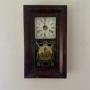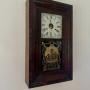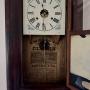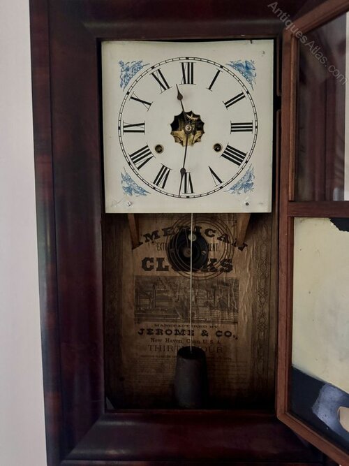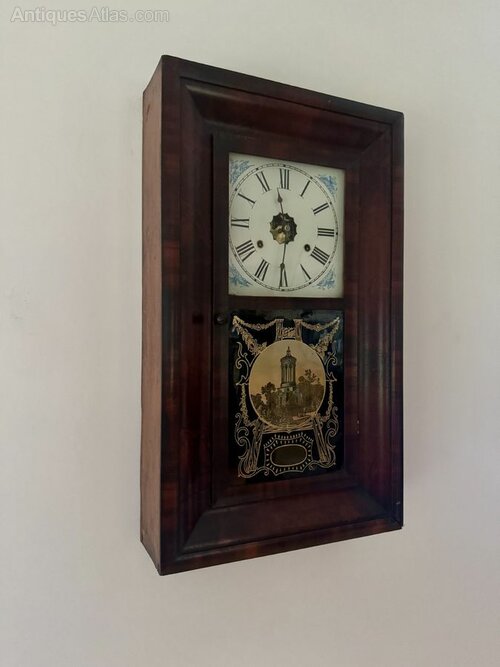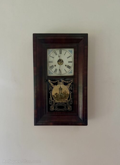 Quality 19th century mahogany American wall clock, having a quality antique wall clock with a rectangular shaped mahogany case with a single glazed door with a painted panel depicting the Burns monument, opening to reveal a 9 inch painted dial with Roman numerals and the original black spade hands, a drop down weighted pendulum, having an eight day movement striking on a gong.All clocks get serviced prior to delivery.