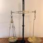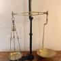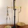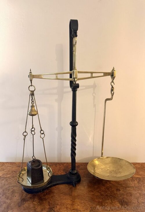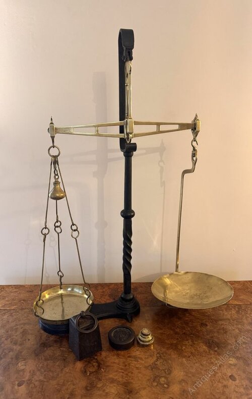 Quality pair of antique Victorian balance scales, having a central cast iron support holding brass weighting pans accompanied by weights.H 74cm
