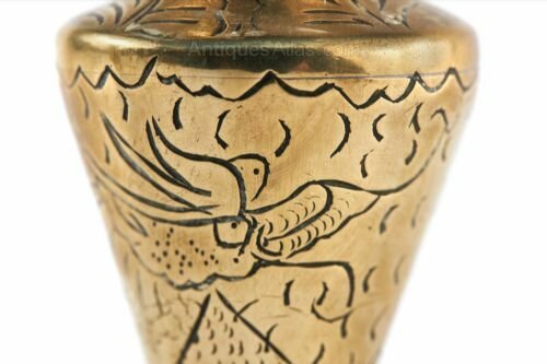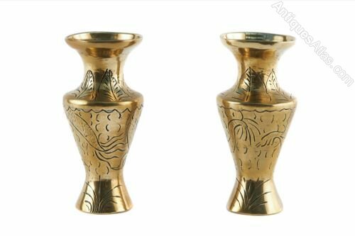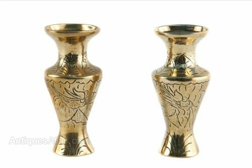 Small Antique Pair Of Chinese Brass Vases of good quality, lovely shape and all over engraving with dragons.H 10cm