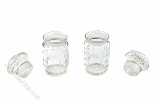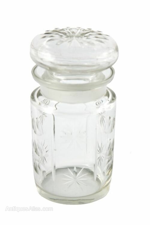 Pretty pair of Antique Cut Glass Jars, good quality having cut glass star decoration to the original lids and sides along with cut glass circle decoration.H 15CM
