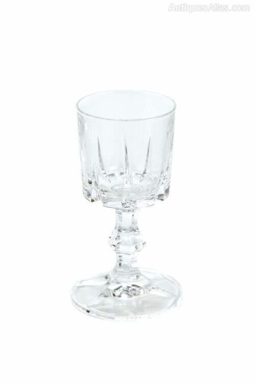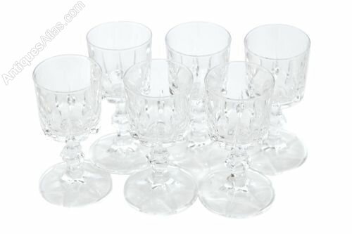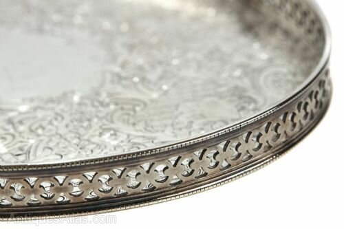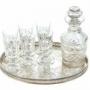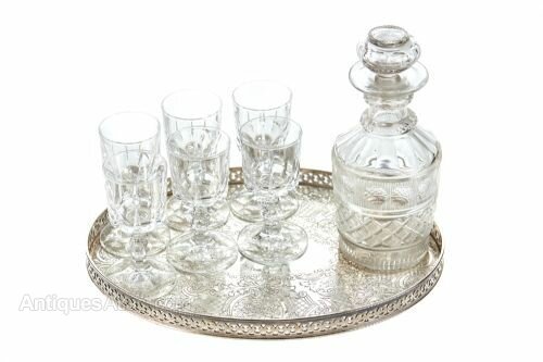 Antique Decanter Drinks Set On Silver Plated Tray, set of 6 matching antique glasses with cut glass decanter and original stopper. Presented on a Mappin & Webb silver plated ornate tray.The crystal glasses are 10cm tall with a 5cm rim diameter