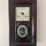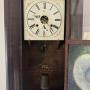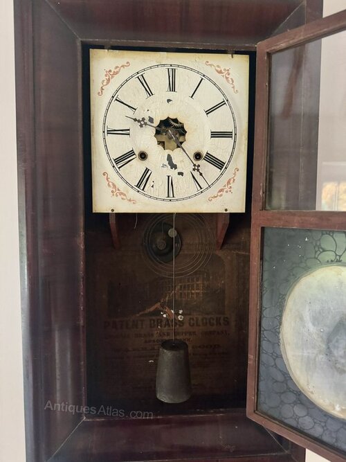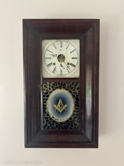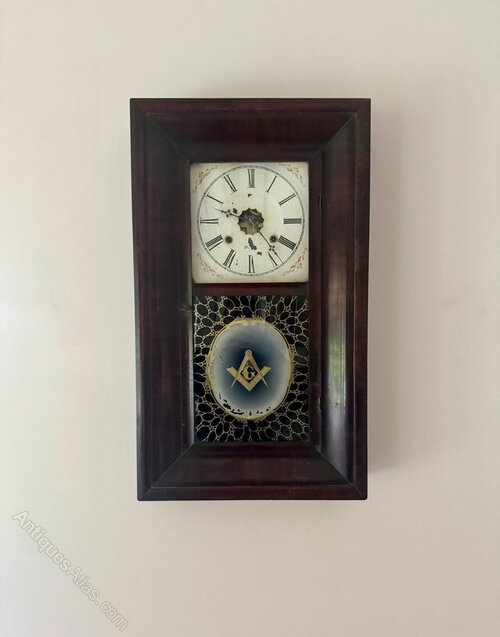 Antique 19th Century American mahogany wall clock, having a quality 19th century wall clock with a rectangular shaped case with a single glass panel to the front, having a painted dial to the top with black Roman numerals and black ornate hands above a painted masonic emblems panel, having the original drop down weighted pendulum, with a eight day movement striking on a gong.All clocks get serviced prior to delivery.