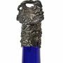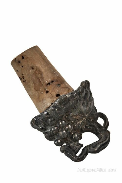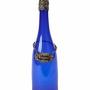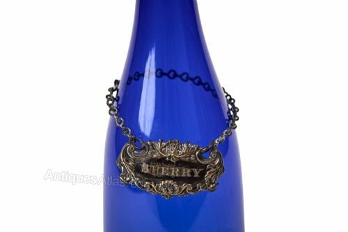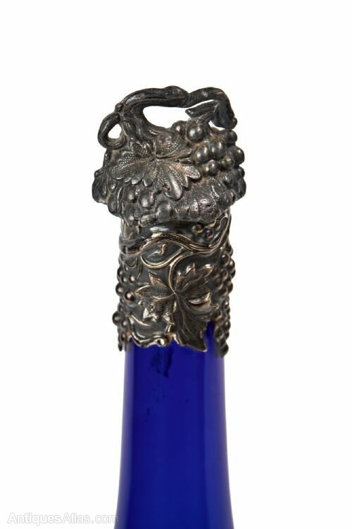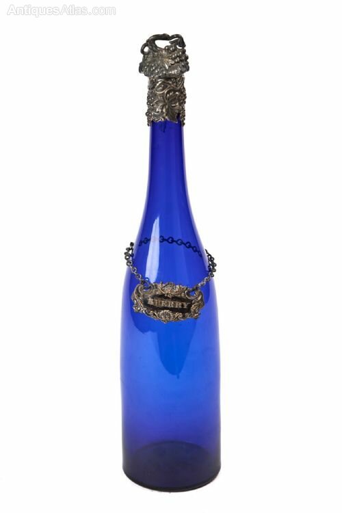 Beautiful Victorian Blue Glass Wine Bottle with silver neck, the plated fruiting vine stopper above the silver fruiting vine neck with silver plated decanter sherry label.Hallmarks Birmingham 1854