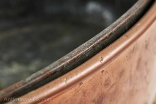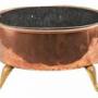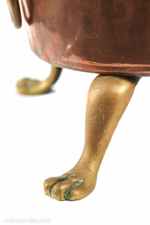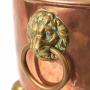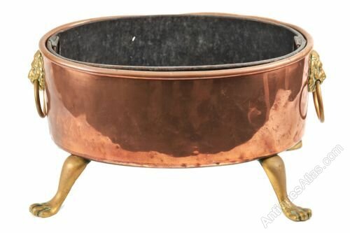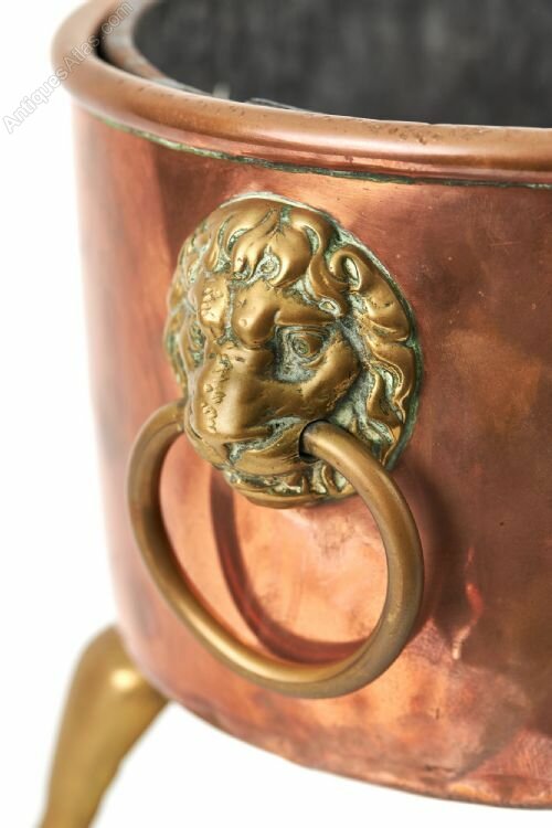 Antique Copper And Brass Planter having lion mask loop handles to either side of the oval copper body, raised on four brass paw feet, having original removable metal liner.Lovely colours and condition.
