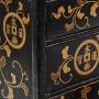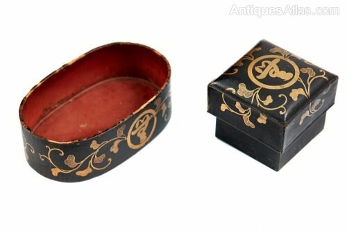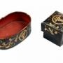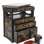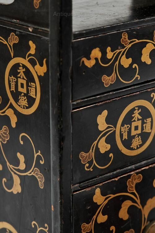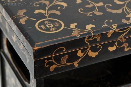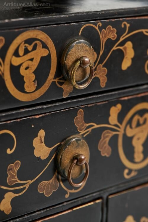 Antique Japanese Black Lacquered Table Cabinet, having a quality lacquered lift off lid above 4 drawers with original handles, containing 2 small matching lacquered boxes. Decorated all over in gold colours with roundels and scrolling foliage.Lovely original antique condition consistent with age and use.