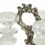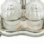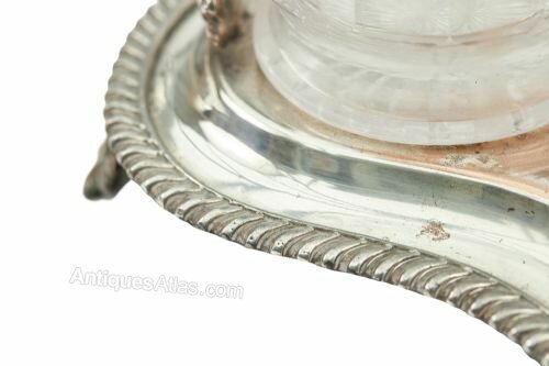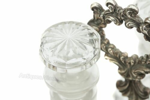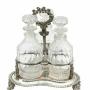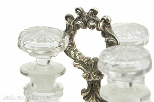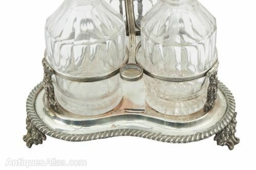 Antique Old Sheffield Plate Three Bottle Decanter Cruet having a loop handle and scrolling border, raised on pierced scrolling feet with three cut glass decanters and original stoppers.Good colour and condition, consistent with age and use.