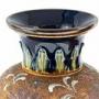 Pair Of Quality Antique Royal Doulton Vases with lovely hand painted blue and green decoration to the top and bottom of the vase and gold, red and white hand painted decoration to the middle standing on a circular base. Lovely colours and condition.H 30cm