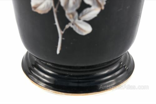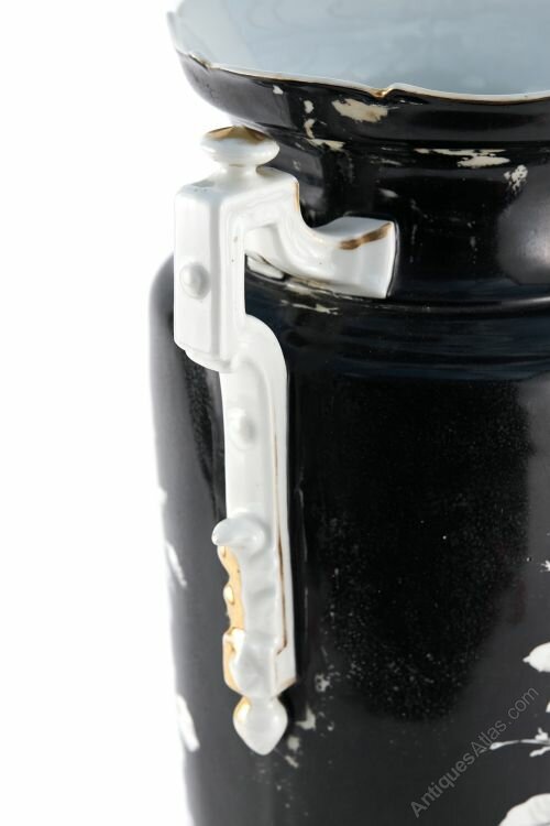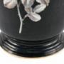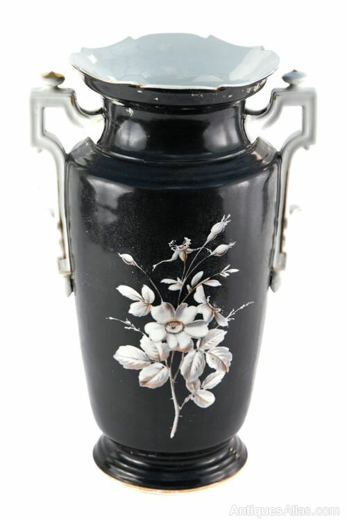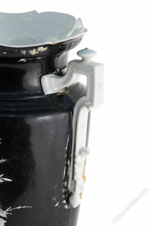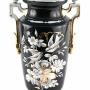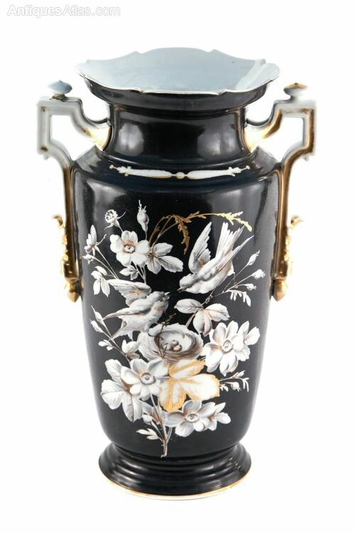 Large Antique Victorian Hand Painted Opaque Glass Vase with shaped gilded gold handles and wonderful bird and floral decoration in white yellow and gold colours with a black background. Classical vase shape on a circular base.H 39cm