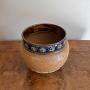 Fine quality antique Victorian Doulton Lambeth jardiniere, having a quality antique Doulton Lambeth jardiniere with a brown ground with green and white flowers stemming from the base, having a royal blue band round the rim decorated with green flowers, with a glazed finish, stamped to the base as shown.H 22cm