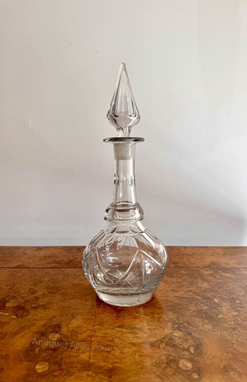 Fine quality antique Victorian glass decanter, having a quality antique Victorian decanter with a round shaped cut glass body with a slender shaped neck and the original pointed stopper.H 34cm