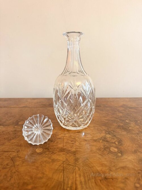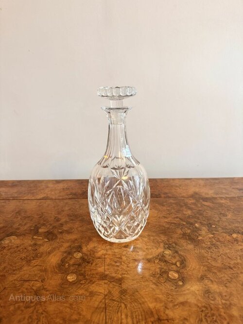 Quality antique Edwardian decanter, having a quality antique Edwardian decanter with a bulbous shaped cut glass body, a slender neck with the original cut glass mushroom shaped stopper.H 26cm